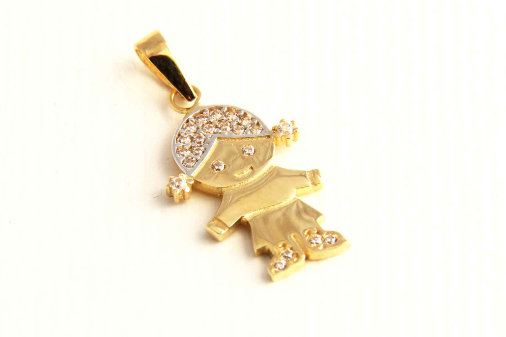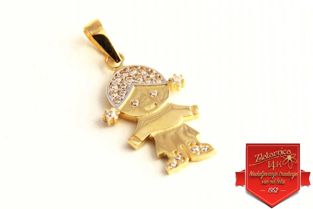 Obesek v obliki ljubke punčke iz rumenega zlata s vkovanimi cirkoni v lepo vidnih detajlih.