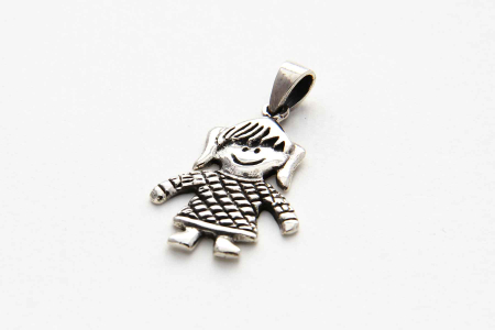 Srebrni obesek v obliki punčke z patiniranimi detajli.