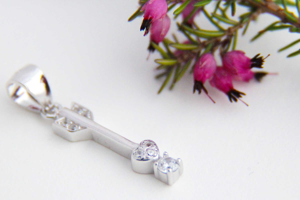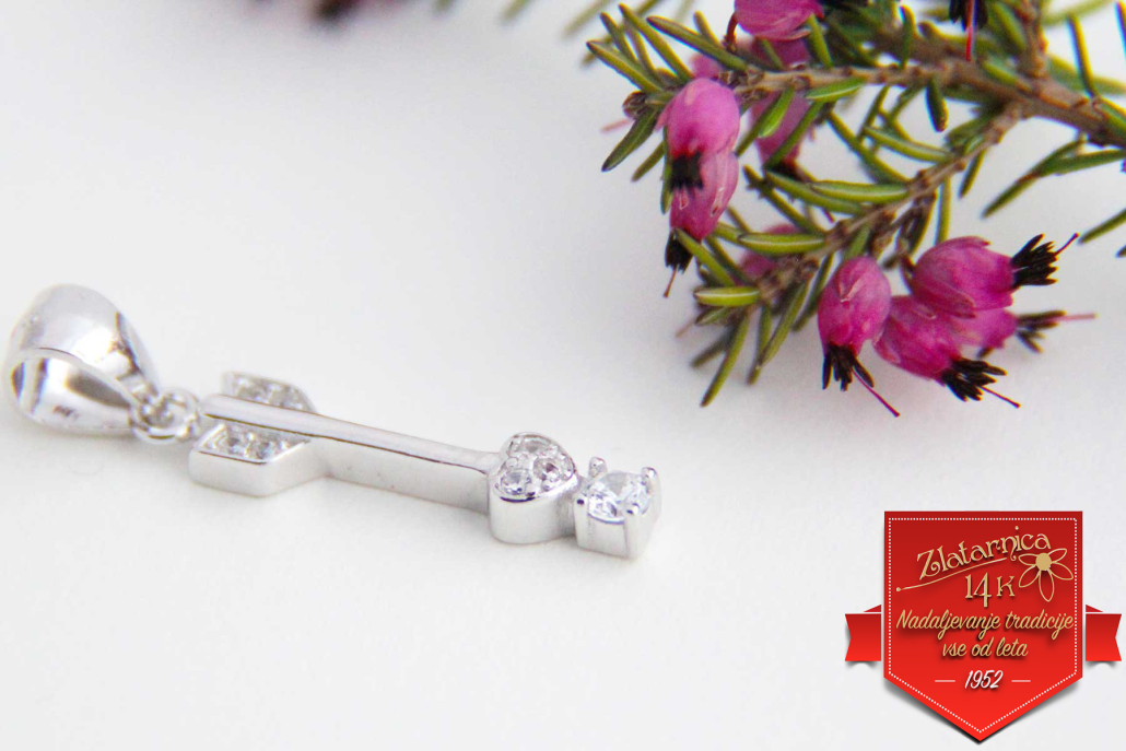 Srebrni obesek v obliki puščice, katere konica je oblikovana v srce, ki se ga drži cirkon. Peresa in konica puščice so obdelane s vkovanimi cirkoni.