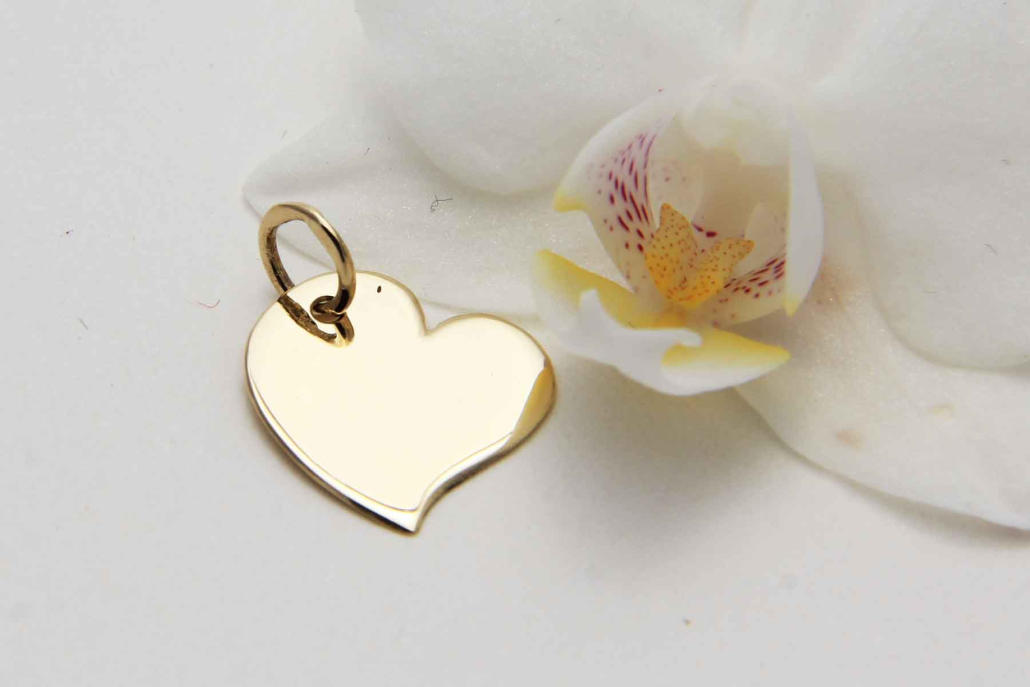 Obesek iz rumenega zlata v obliki velikega gladkega srca. Primeren za poljubno gravuro iz obeh strani.