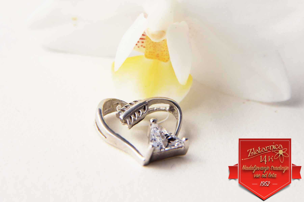 Srebrni obesek v obliki majhnega srca zavitega v puščico s trikotnim cirkonom. Verižica se napelje skozi nevidno ušesce zadaj.