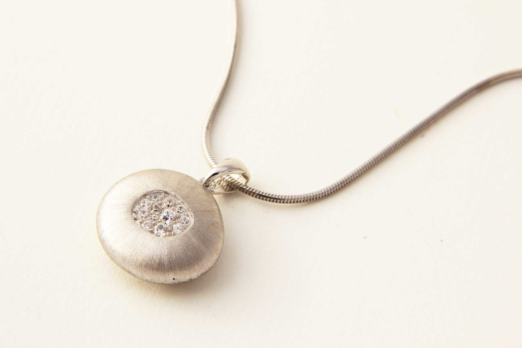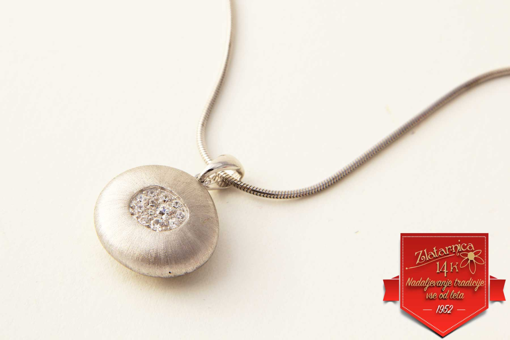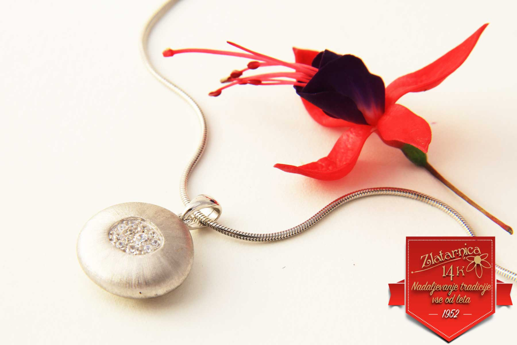 Srebrni obesek v obliki prodnika, matirane površine s cirkoni v osrednjem delu. Na voljo tudi enak prstan.