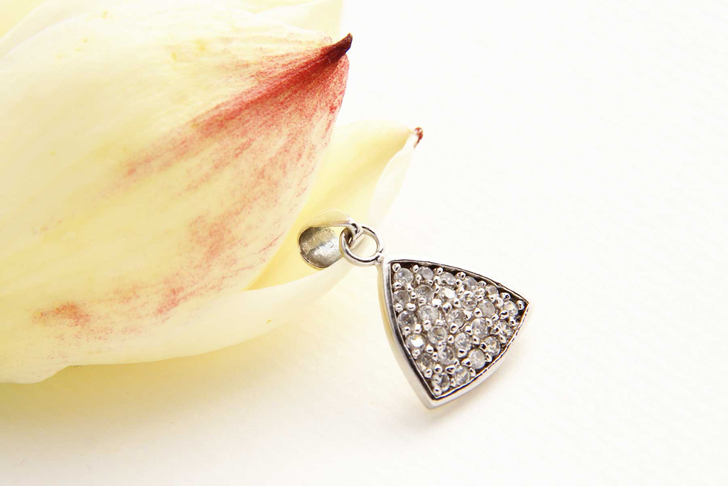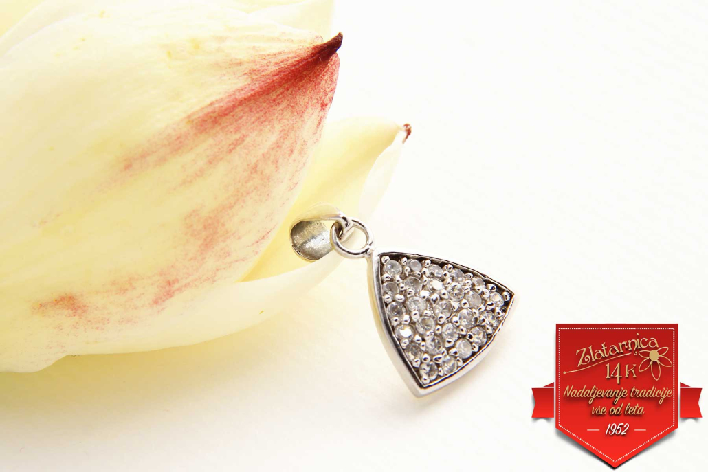 Srebrni obesek v obliki trikotnika s cirkoni.