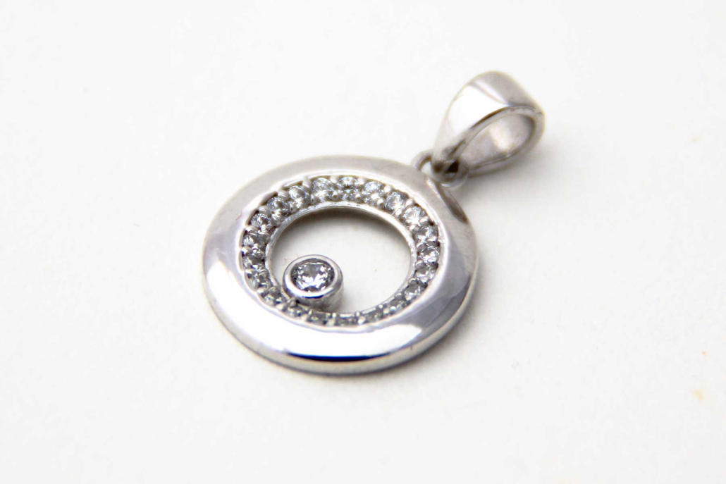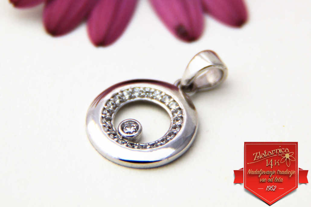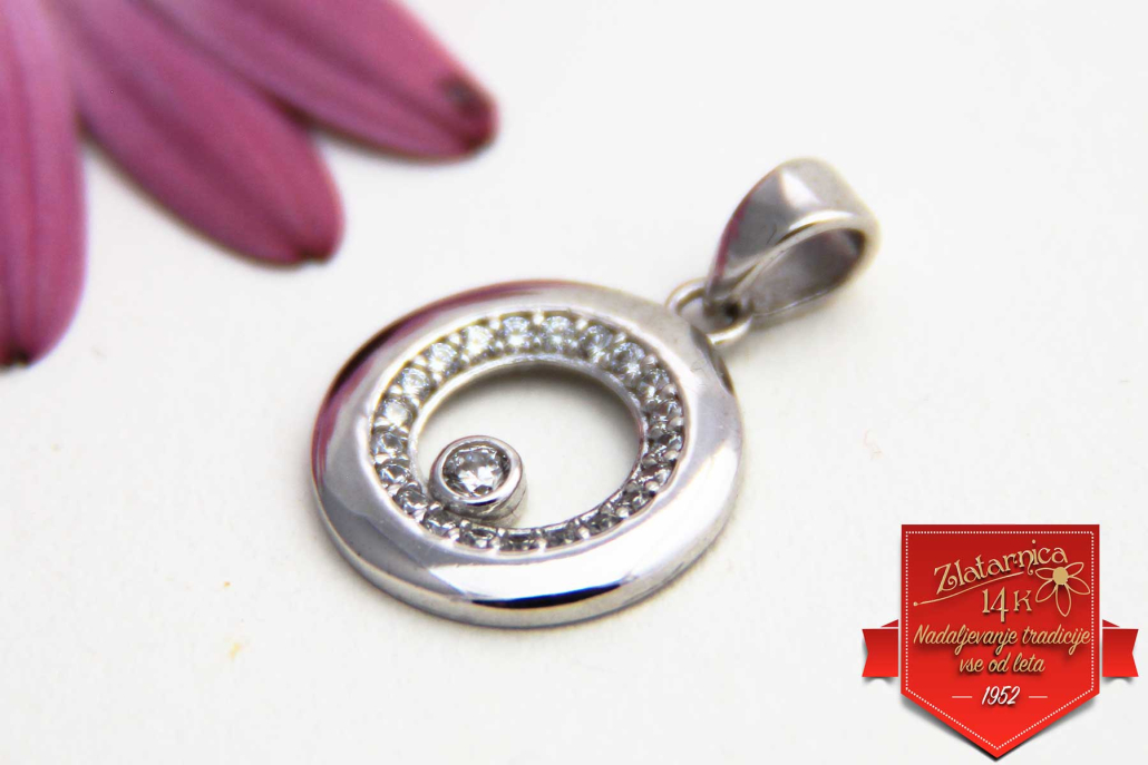 Elegantni obesek v obliki kroga, ki je po notranjem delu okovan z manjšimi cirkoni in z večjim, ki iztopa od podlage.