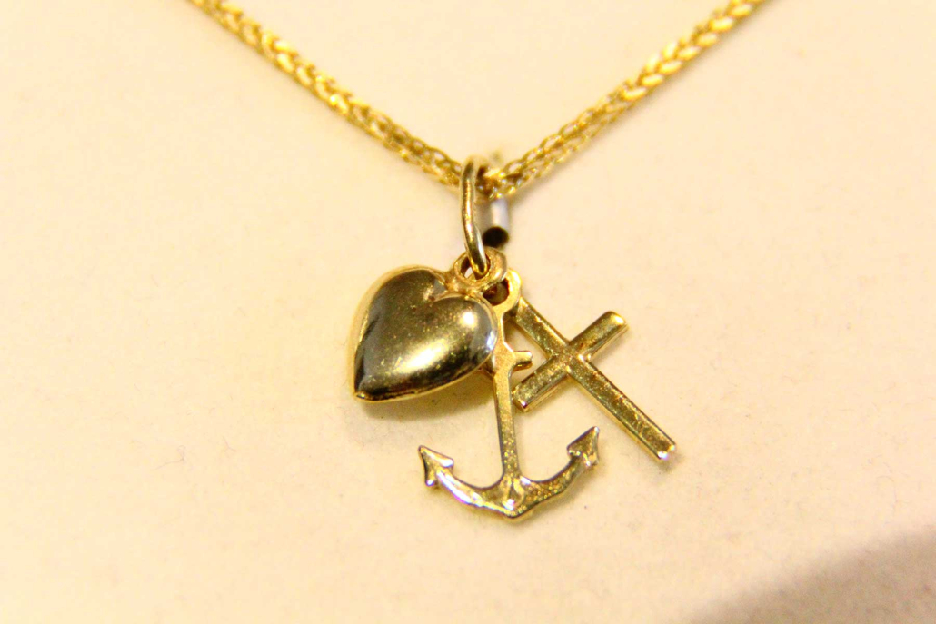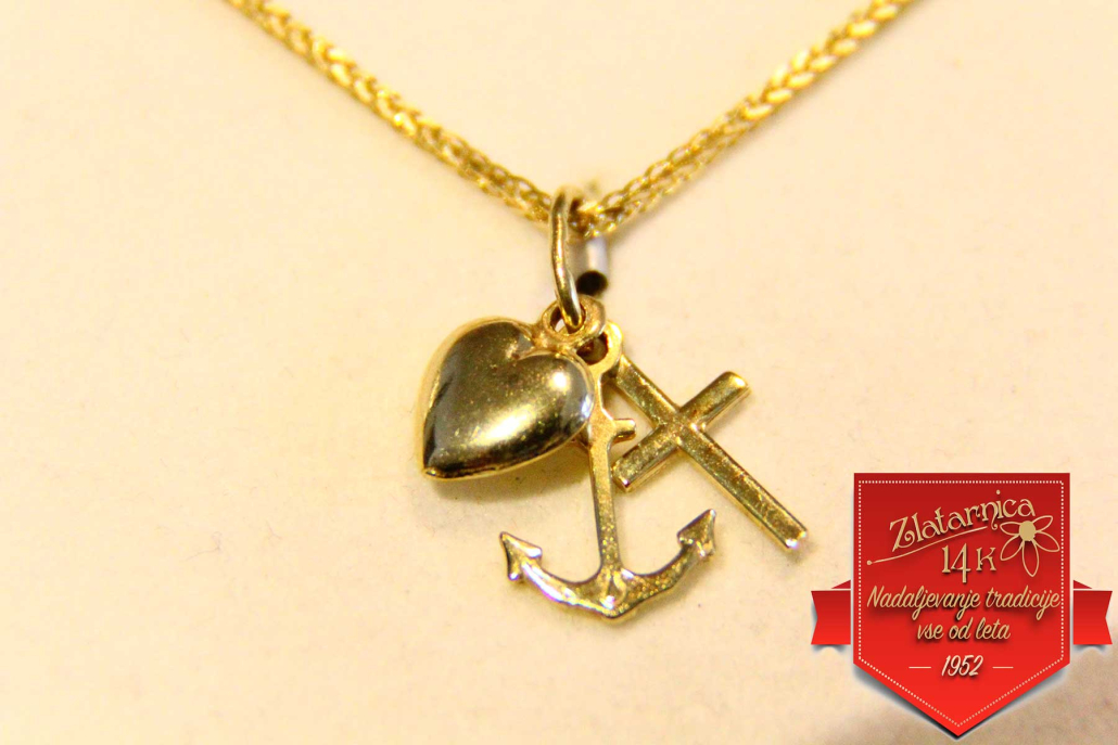 Zlati obesek, ki ga sestavljajo sidro (simbol upanja), srce (simbol ljubezni) in križec (simbolj vere).