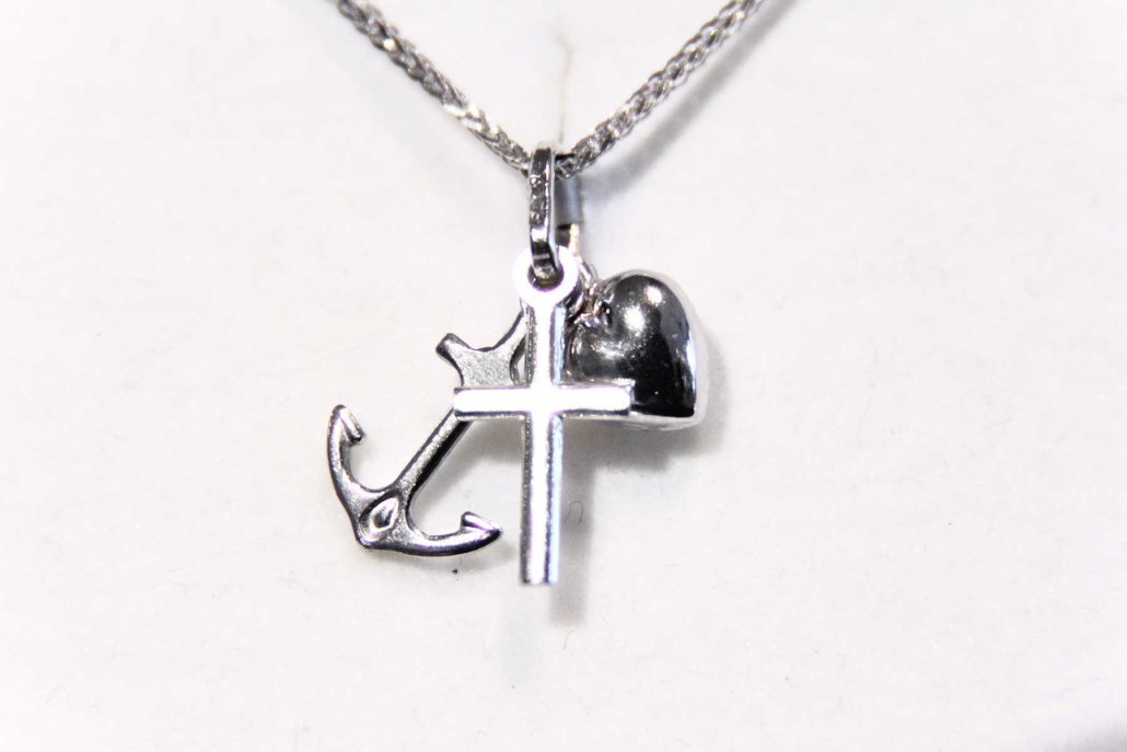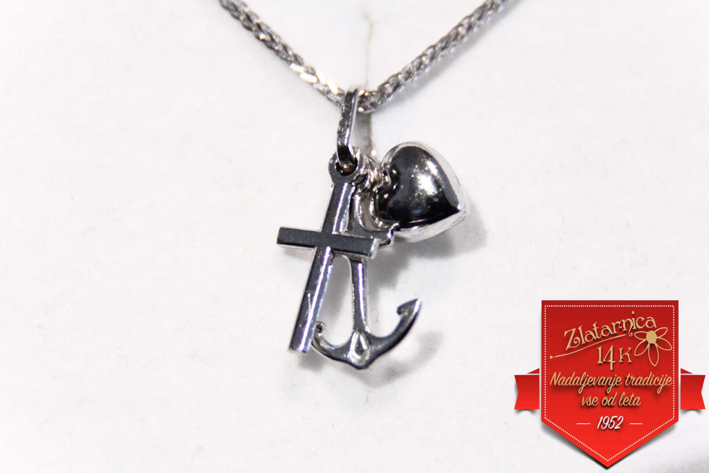 Zlati obesek, ki ga sestavljajo sidro (simbol upanja), srce (simbol ljubezni) in križec (simbolj vere).