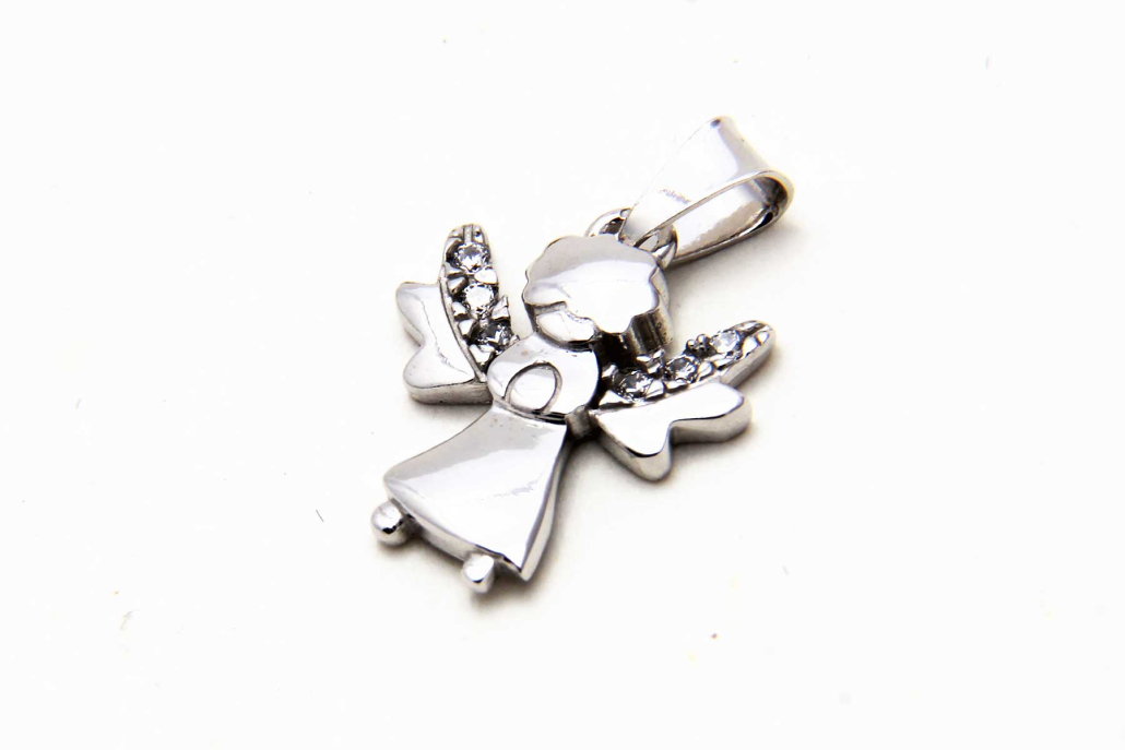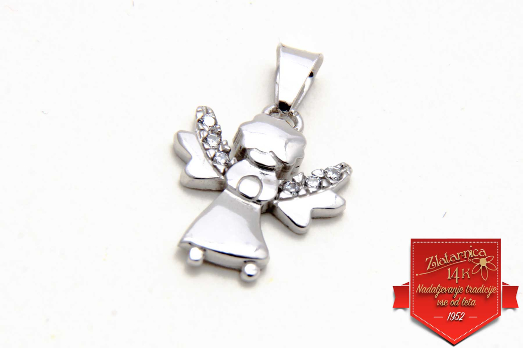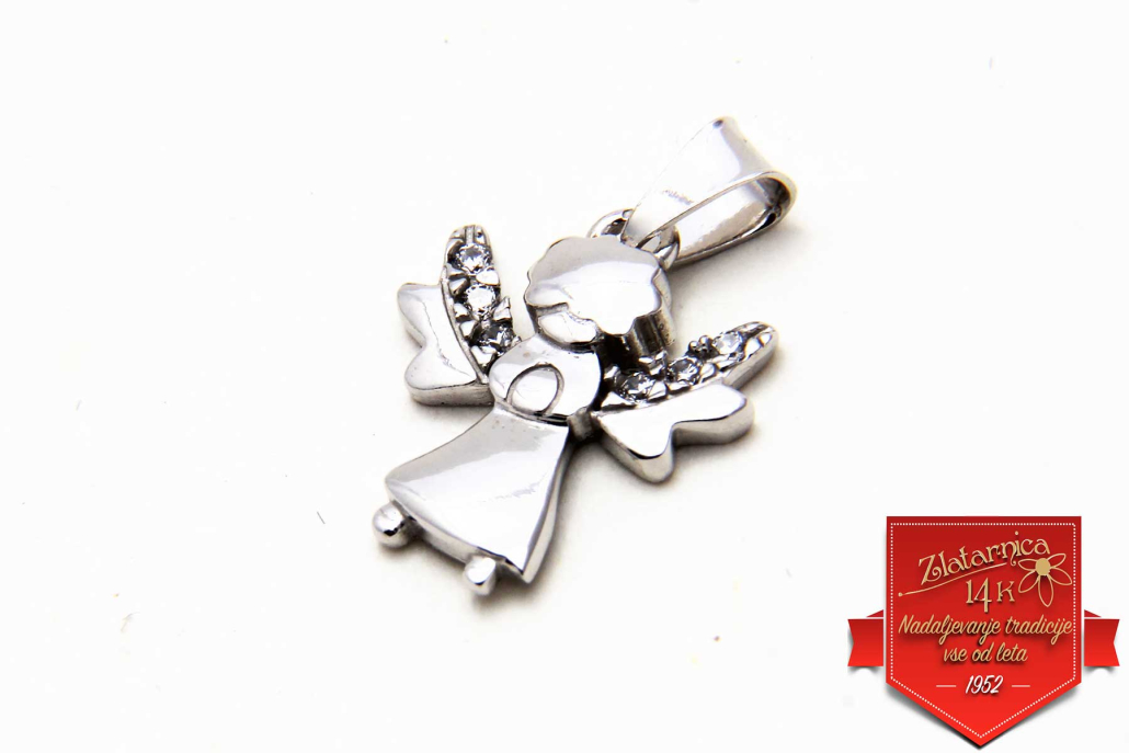 Obesek iz belega zlata v obliki veselega angelčka s cirkoni na krilih.