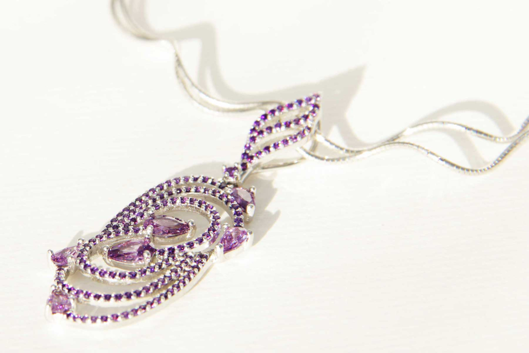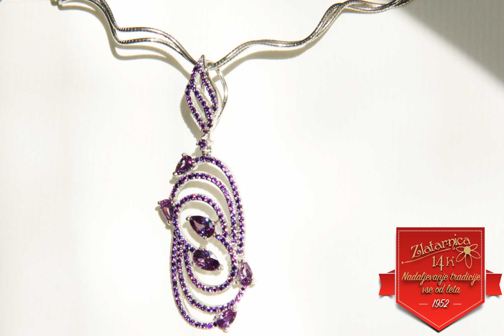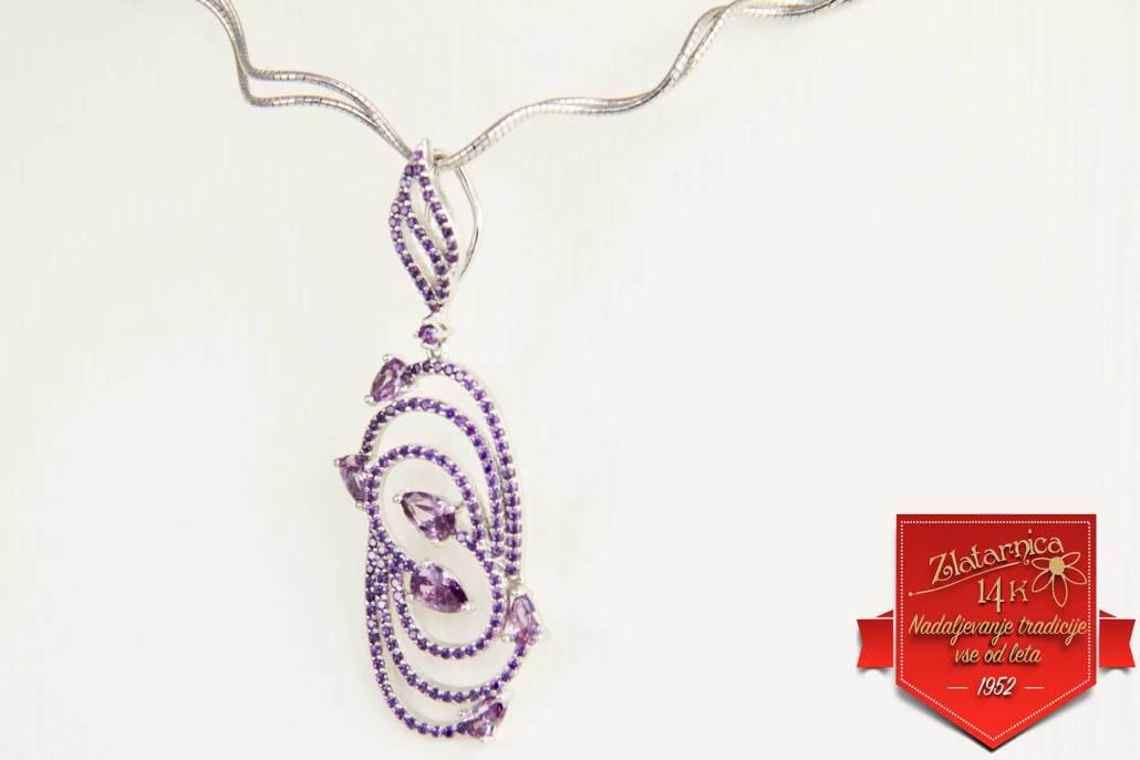Eleganten srebrni obesek s cirkoni vijolične barve.
