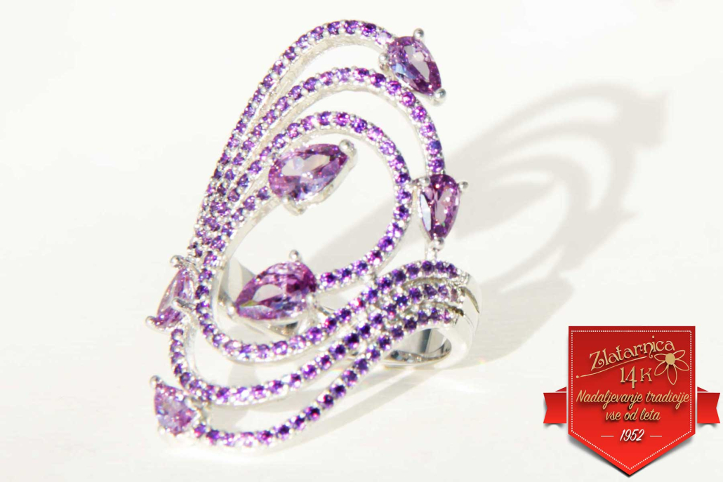 Čudovit srebrni obesek valovitih linij, okovan z vijoličnimi cirkoni po celotni površini. Na voljo je tudi ujemajoči prstan.