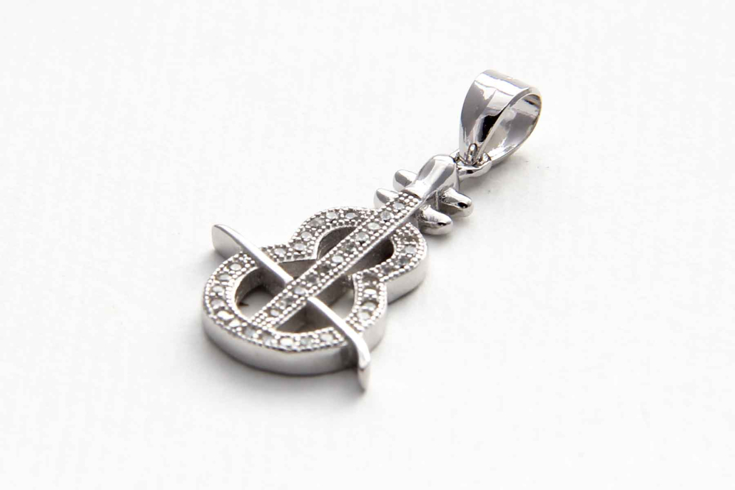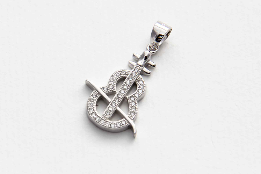 Prefinjen obesek v obliki violončela v celoti obdelan z drobnimi cirkoni.