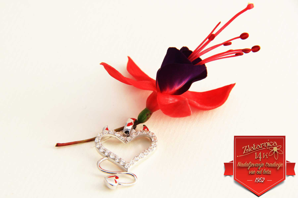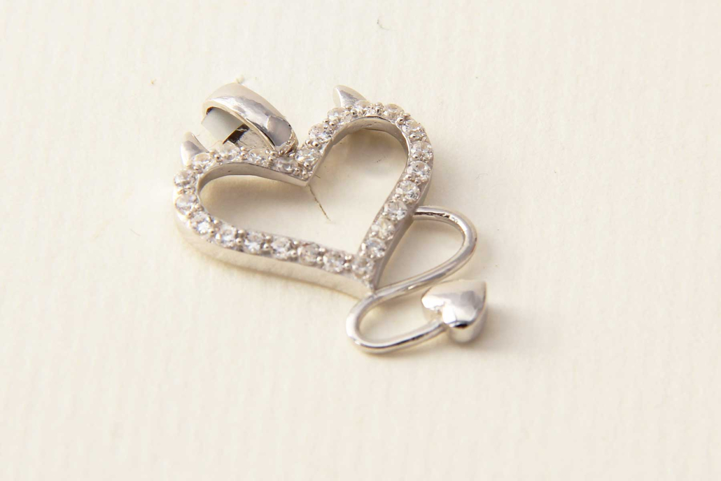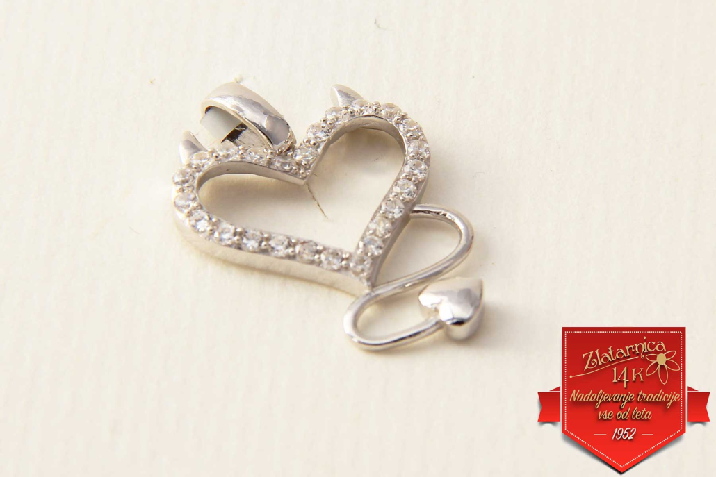 Srebrni obesek v obliki srca okovanega s cirkoni in zavitim vražjim repkom.