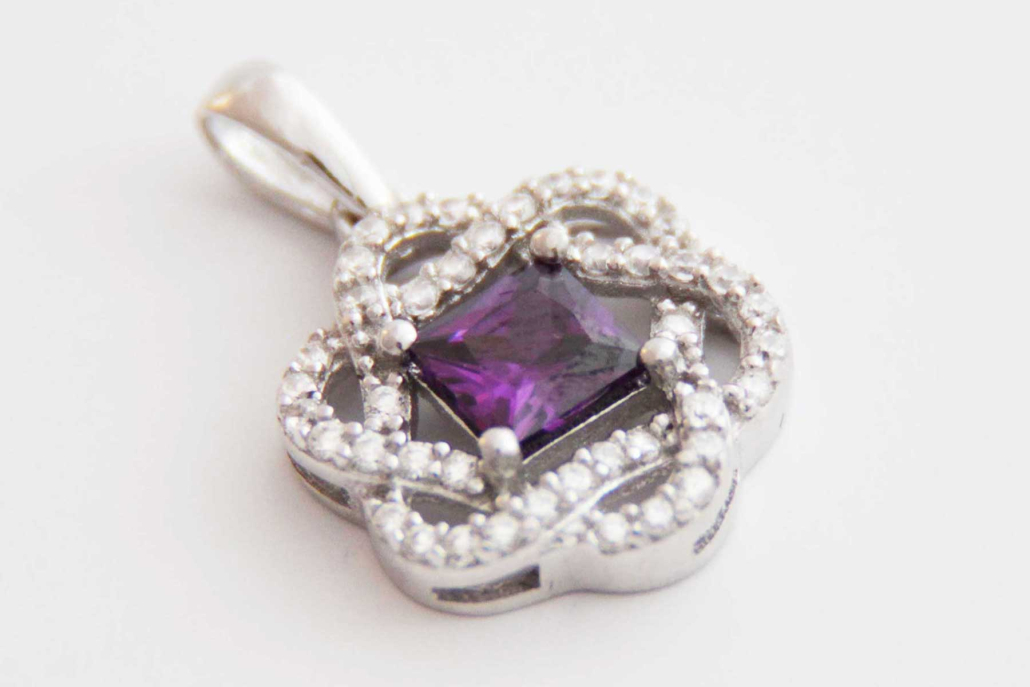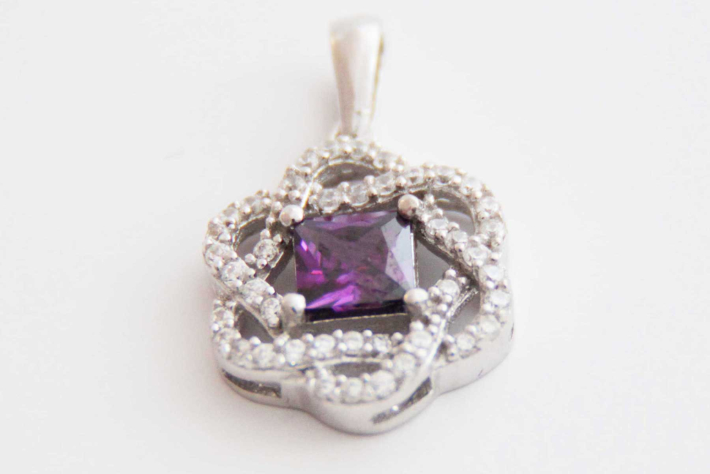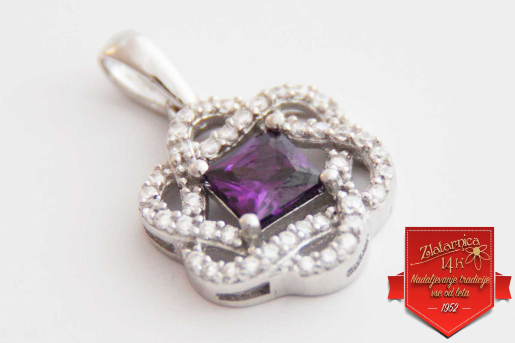 Srebrni obesek v obliki cveta z kvadratnim ametistom, ki ga obdajajo cirkoni.