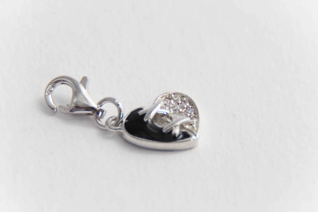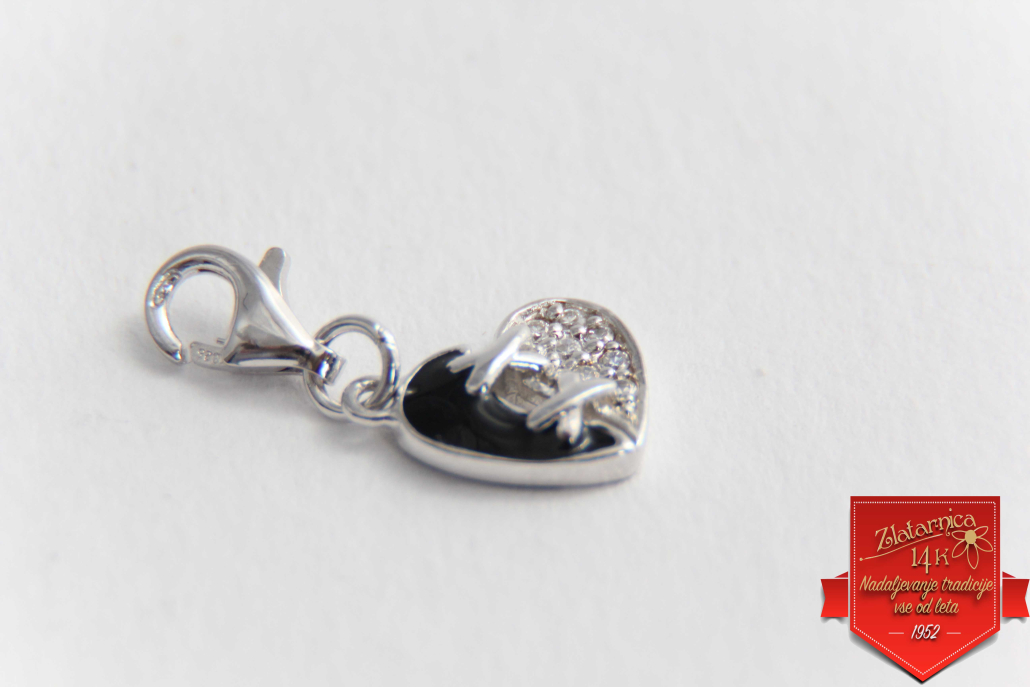 Srebrni obesek v obliki skupaj zašitih dveh polovic srca. Ena polovička je posuta s cirkoni, druga pa obarvana črno. Obesku je dodan tudi srebrni karabin, tako da se lahko obesi tudi na zapestnico.