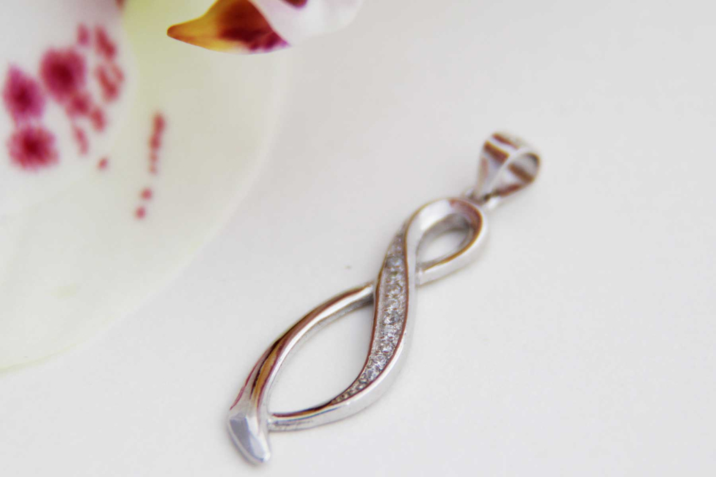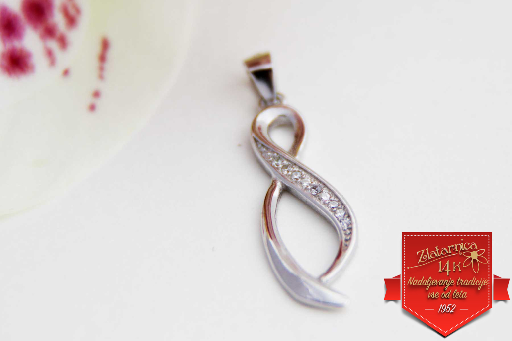 Srebrni obesek v obliki zavite osmice. Površina obeska je gladka in deloma obdelana s cirkoni.