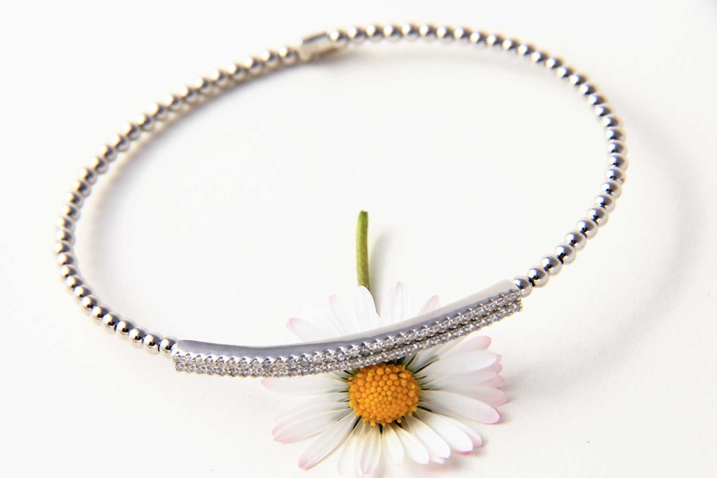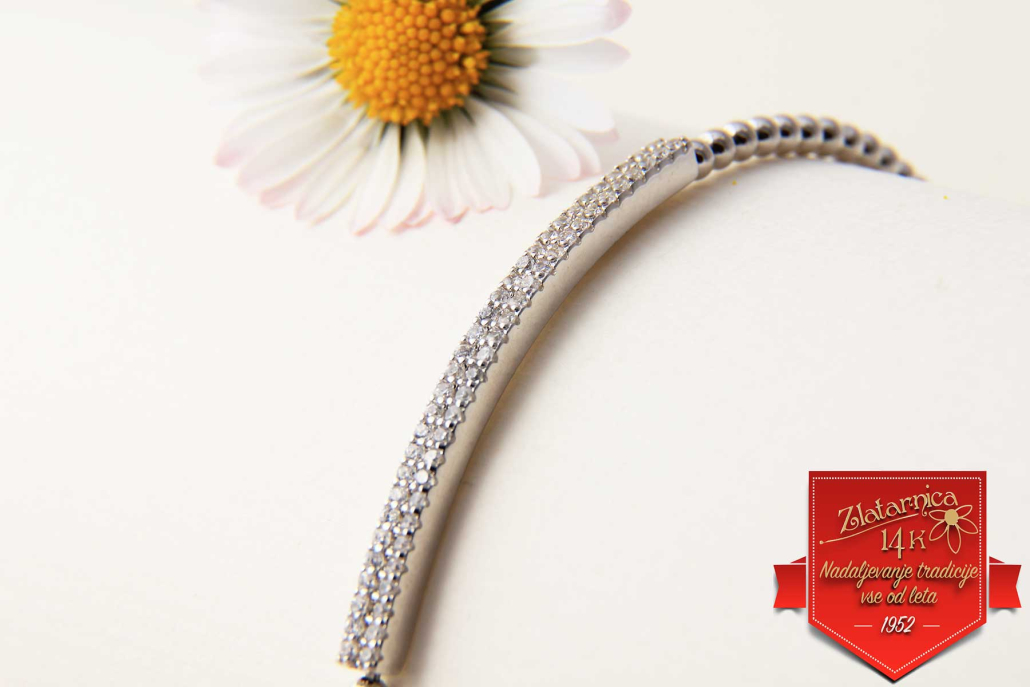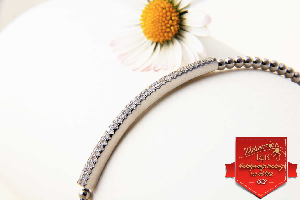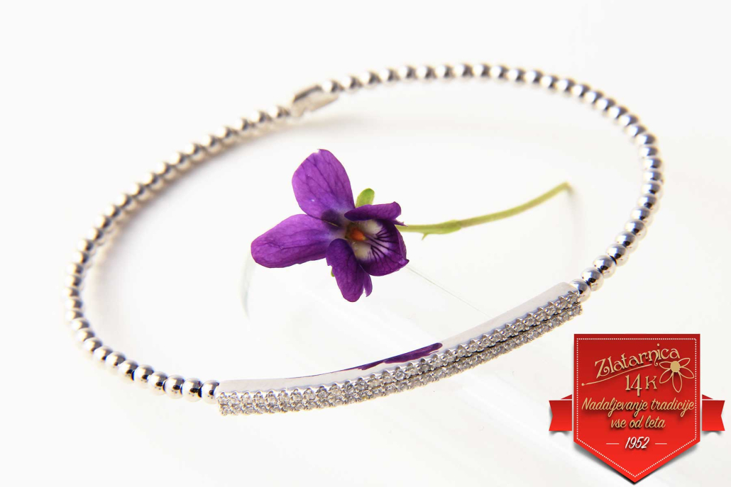 Srebrni gibki obroč iz krogljic s cirkoni vstavljenimi v vzdolžno ploščico.
