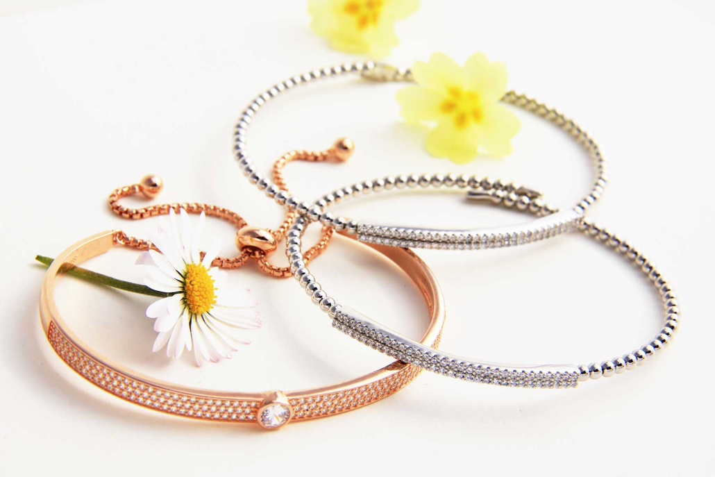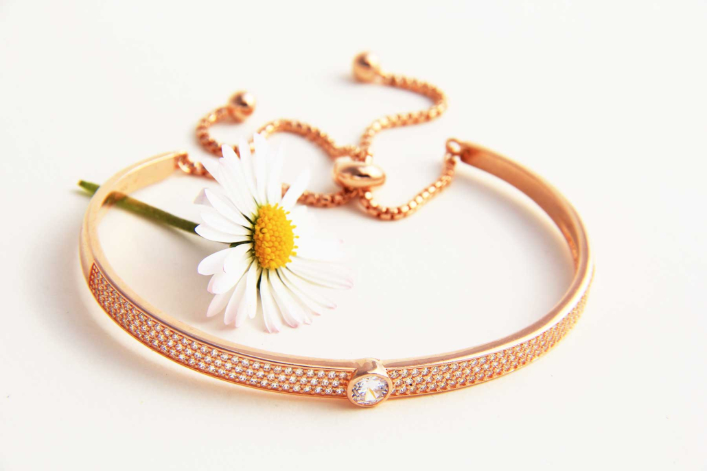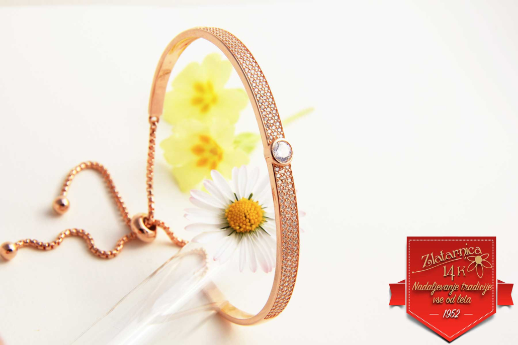 Srebrna zapestnica v obliki rose obroča do polovice obdelanega s cirkoni, ki se zaključi z verižico z krogljicami na zaključkih in drsečim obročkom v vlogi zadrge.