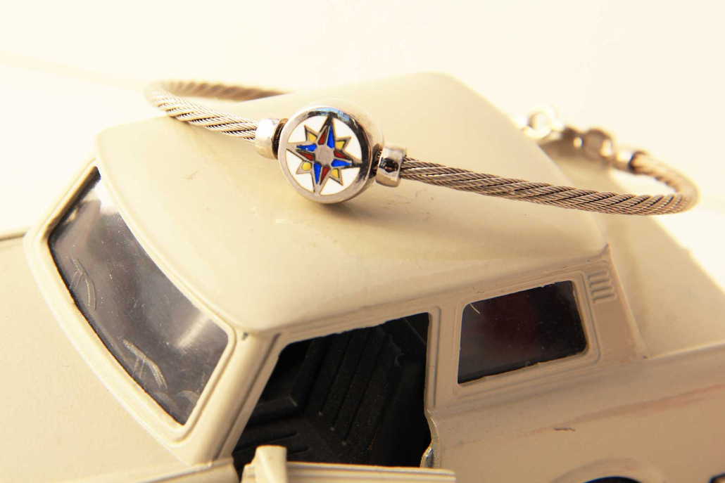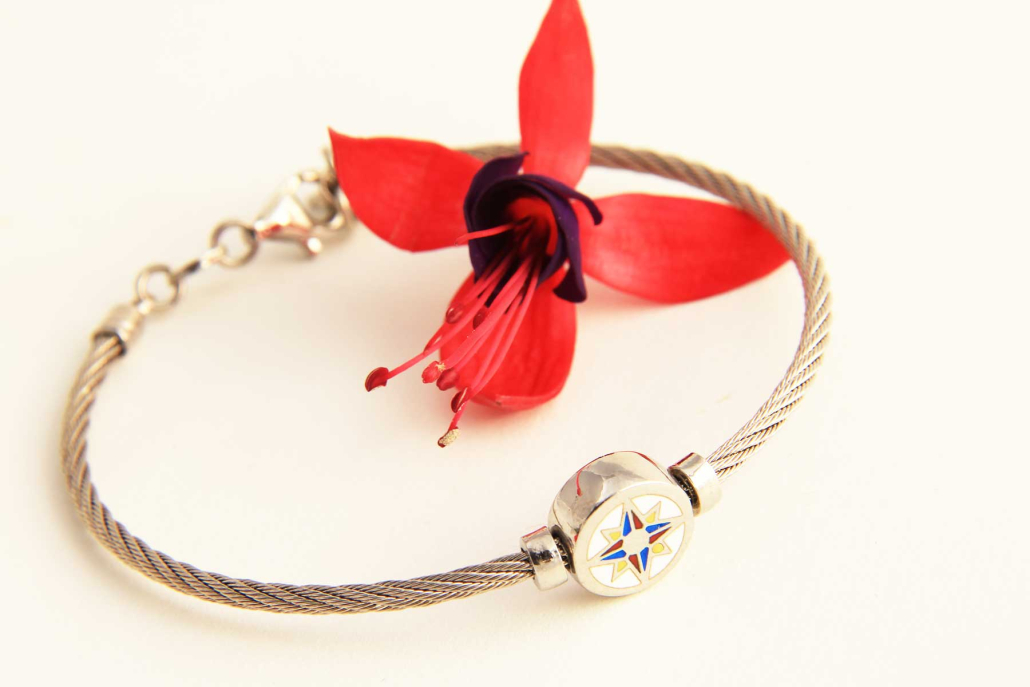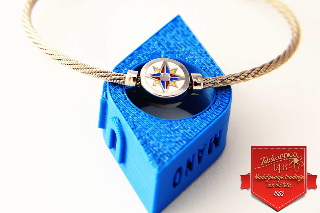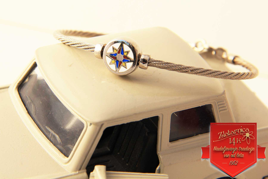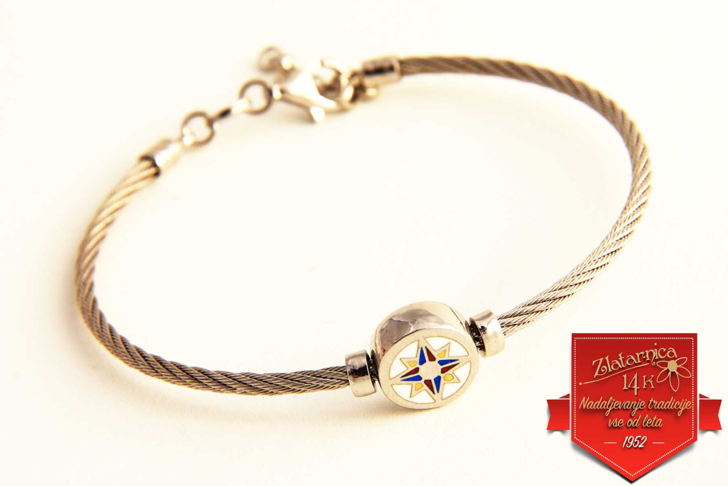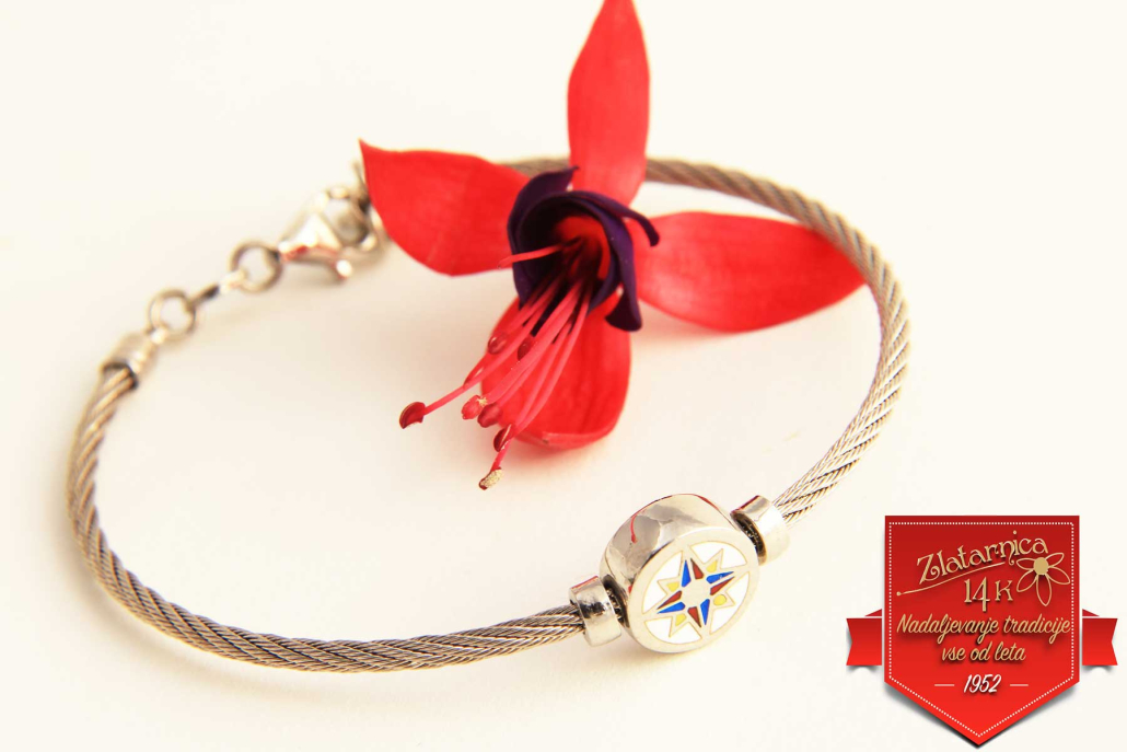 Masivna srebrna zapestnica v obliki jeklenice-elastičnega mat obroča, z vstavljenim krogom na katerem je z emajlom obarvana vetrovnica, ki se lasuče. Na hrbtni strani je kockast vzorec. Zapestnica je primerne tako za moške kot ženske. Zapira se z varnostnim karabinerjem, dolžino lahko nastavljate z dodanim delom verižice.