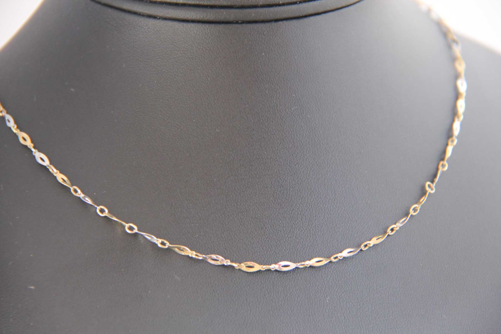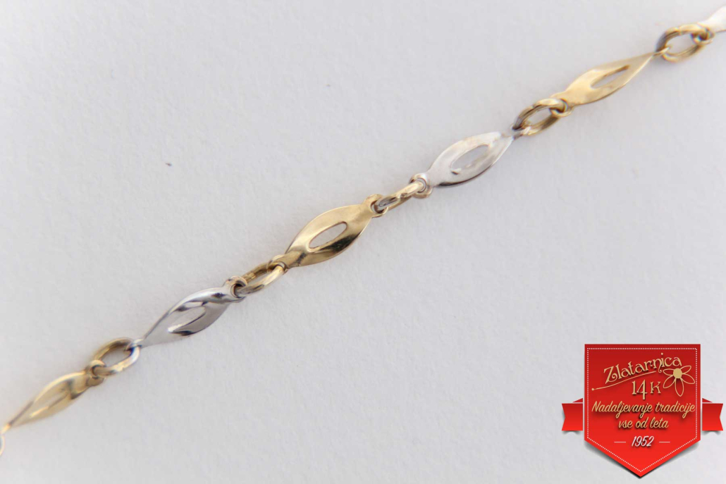 Ogrlica iz kombinacije rumenega in belega zlata, ki jo sestavljajo zaviti ovalni členi z luknjico v sredini.