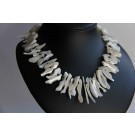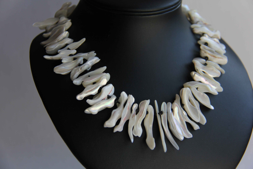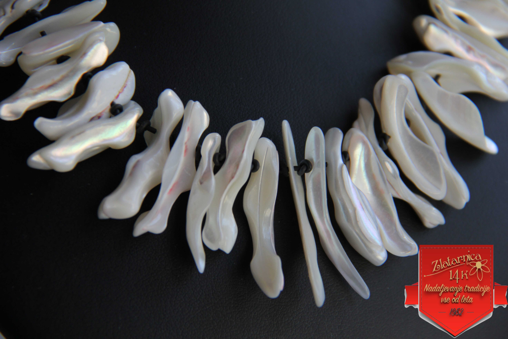 Ogrlica iz kavčuka, na katerega so nanizani deli polirane školjke bisernice-biserne matice. Ogrlico krasi velika srebrna mornarska sponka.