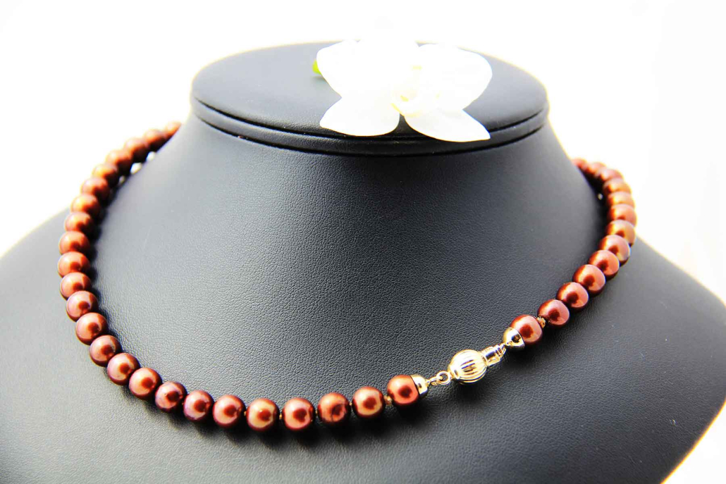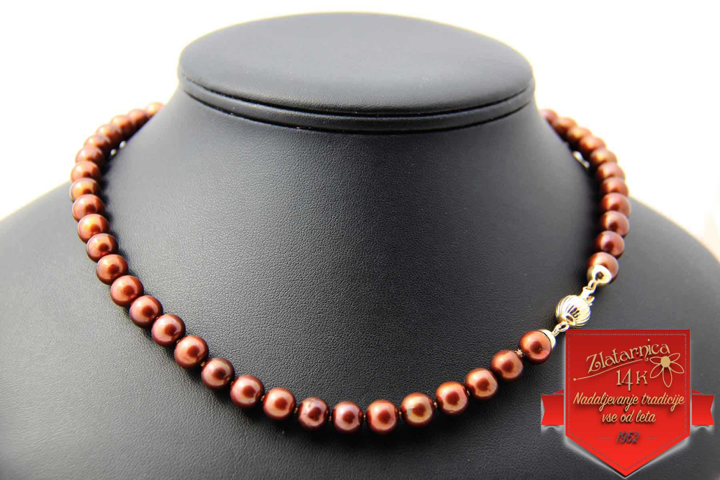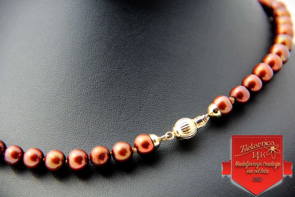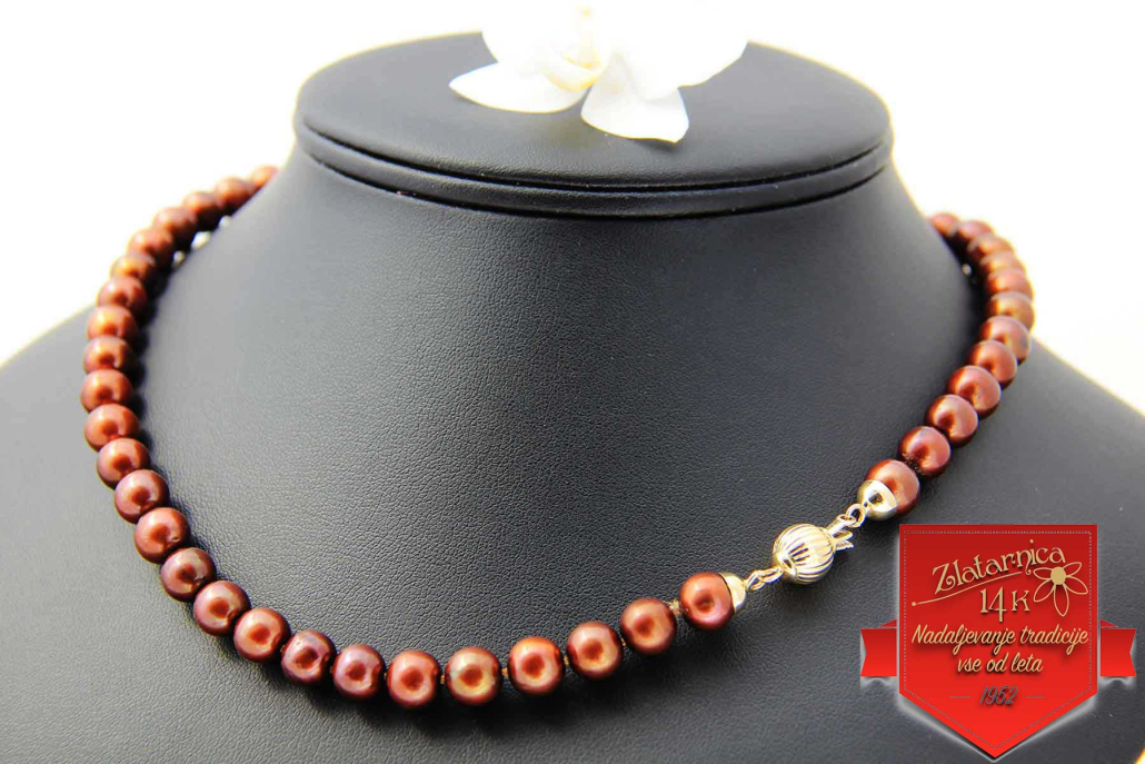 Ogrlica iz obdelanih rjavih, sladkovodnih gojenih biserov, nizanih na vozle okroglo zlato sponko.