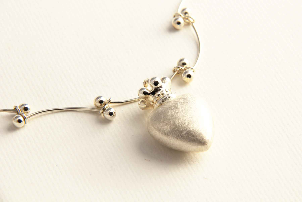 Srebrna ogrlica s poliranimi gladimi kroglicami in obeskom v obliki srca s krono.