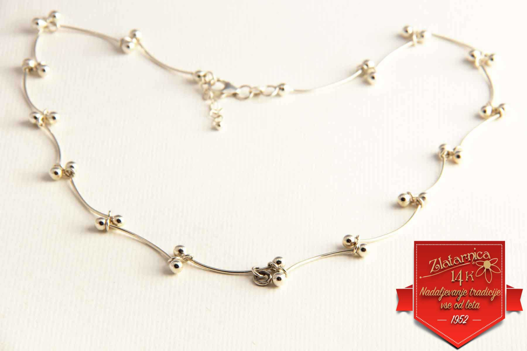Srebrna oglica sestavjena iz palčk in poliranih kroglic z obeskom.