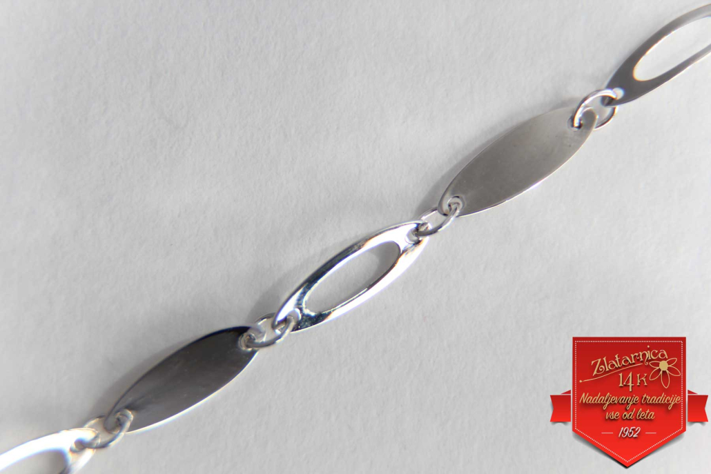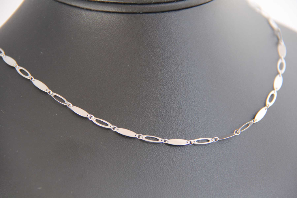 Ogrlica iz ovalnih členov iz belega zlata, kjer se izmenjujejo polne in prazne ploščice.