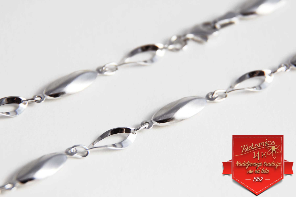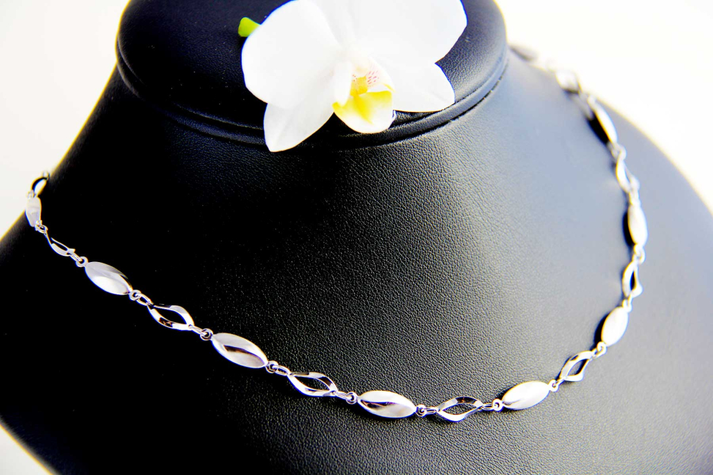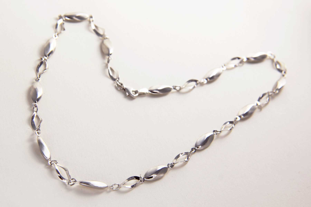 Ogrlica iz belega zlata, sestavljena iz matiranih ovalnih členov in zavitih podolgovatih členov, ki se igrivo izmenjujejo.