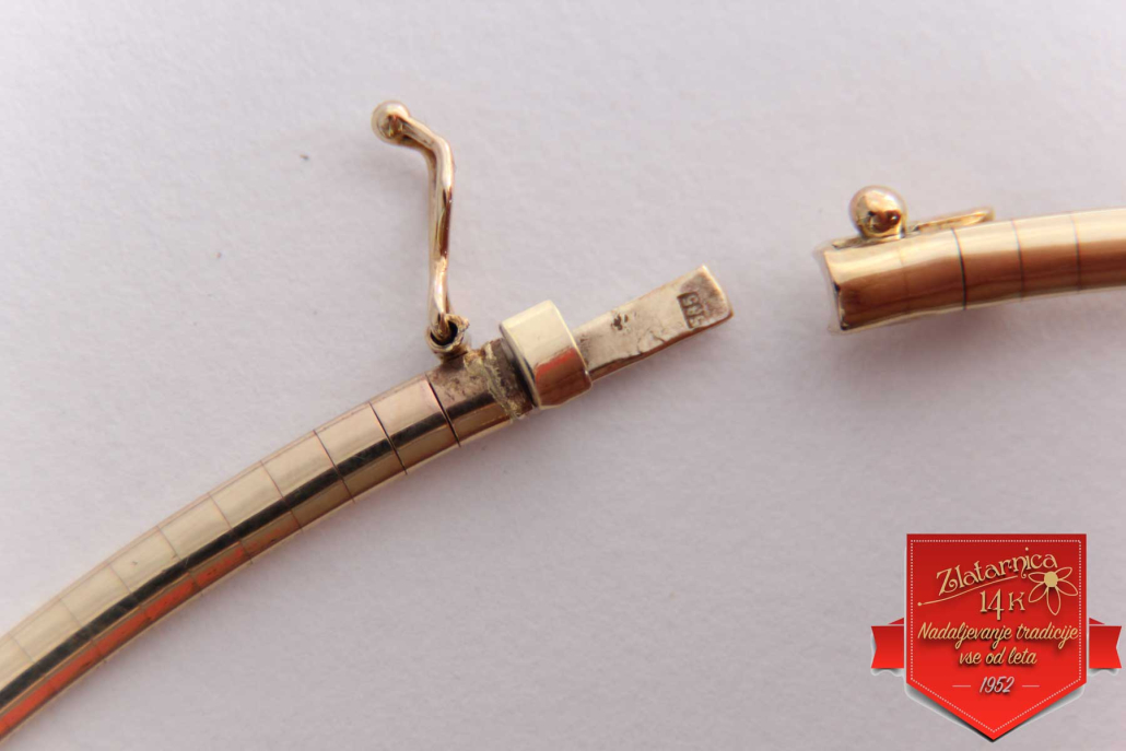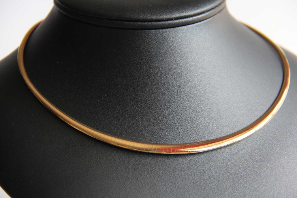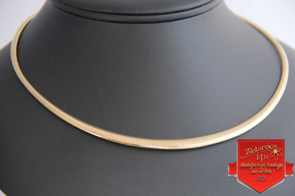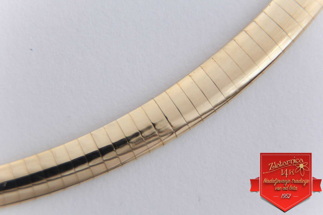 Elegantna prilegajoča se ogrlica v obliki gibkega obroča ki prehaja iz ožjega v širši del na sredini.
