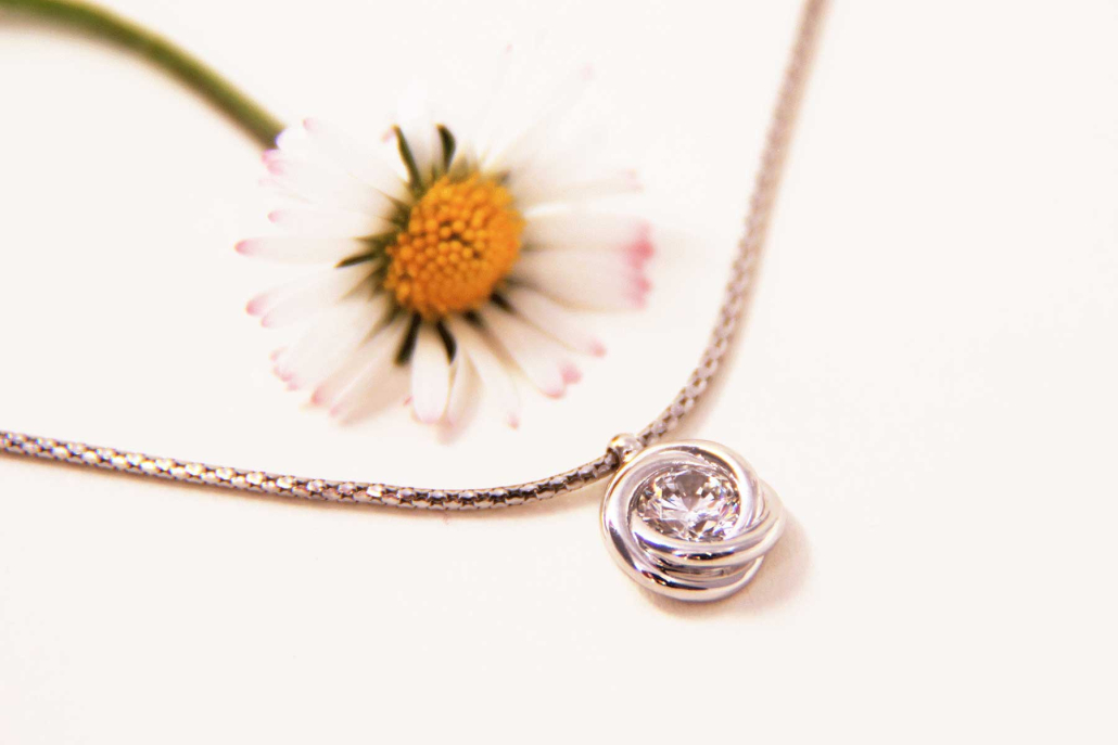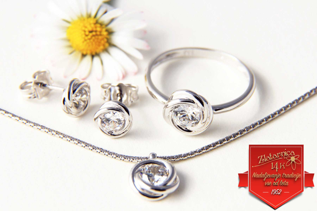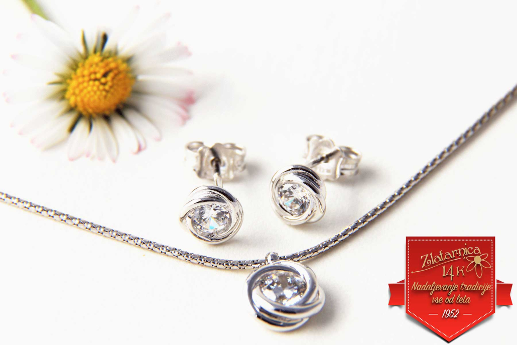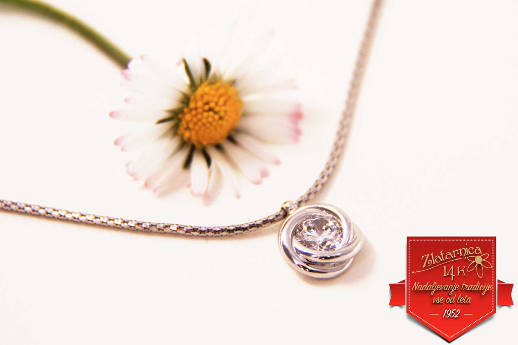 Gladka verižica iz belega zlata z obeskom v obliki cvetnega popka s vkovanim cirkonom med lističi. Zraven se lepo podajo enaki uhani in prstan.