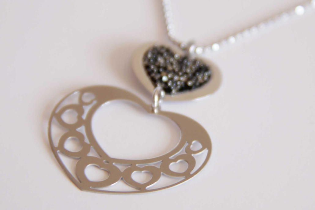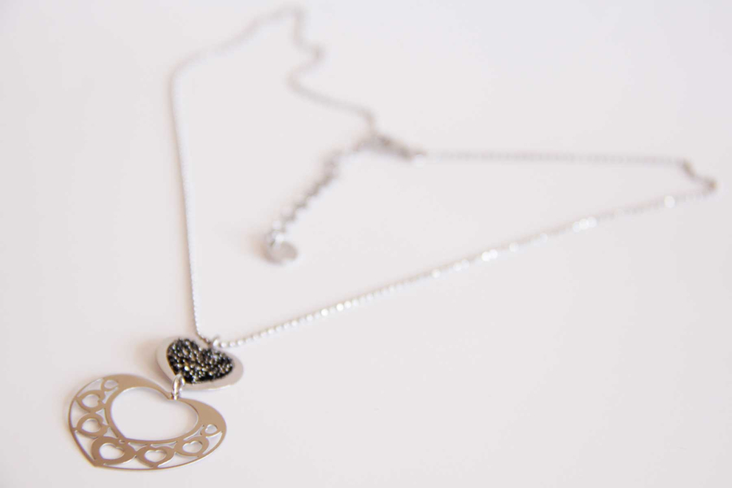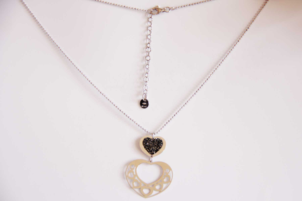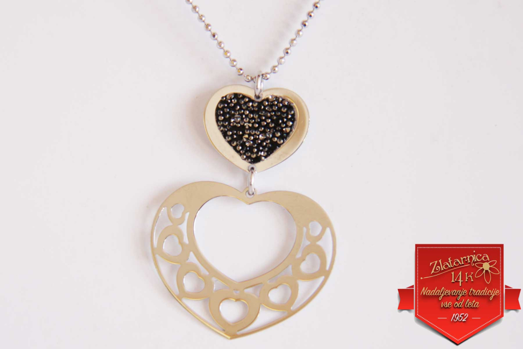 Verižica iz bunkic z obeskoma v obliki srčkov. V zgornjem obesku so vkovani črni cirkoni, spodnji je sestavljen iz izrezljanih srčkov različnih velikosti.