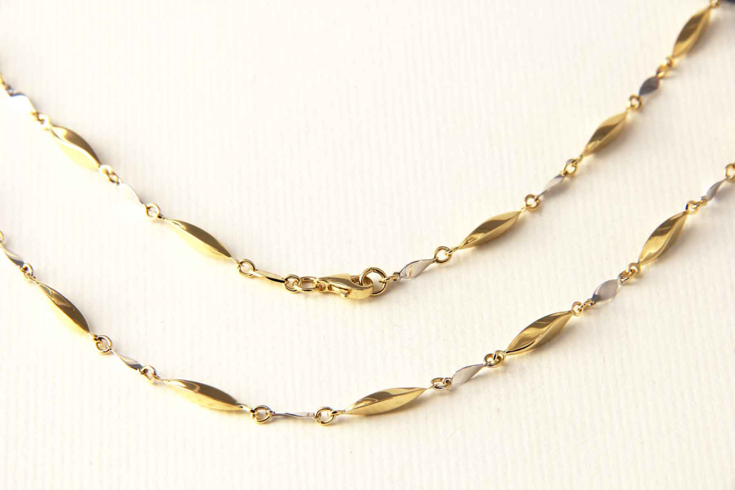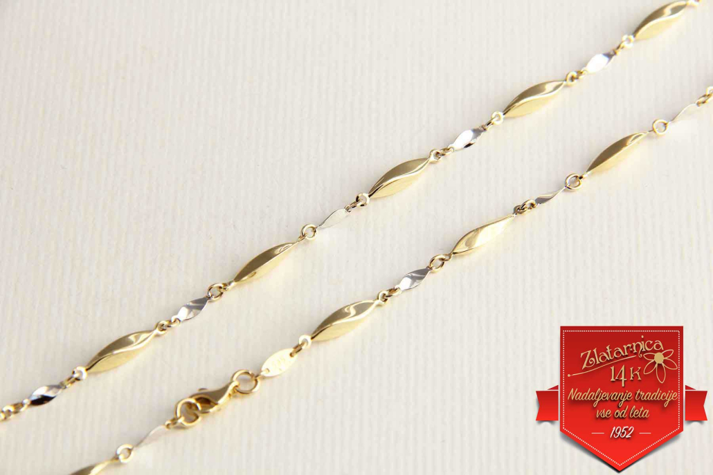 Ogrlica iz kombinacije rumenega in belega zlata.Sestavljena je iz rumenih vzdolžih, zavitih členov in belih manjših ploščic. Zapira se z varnostnim karabinerjem.