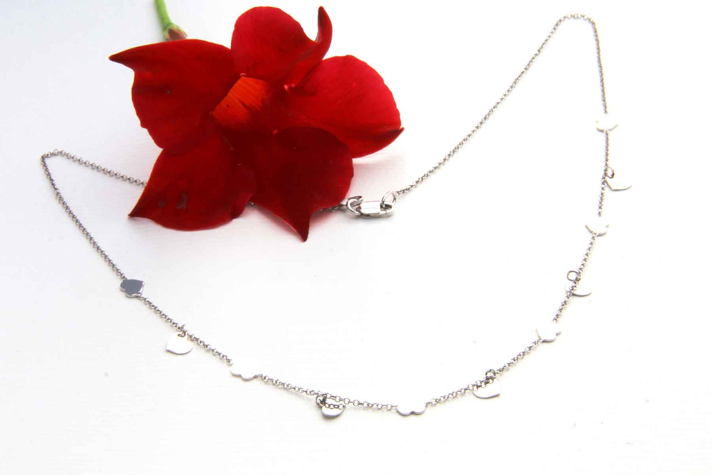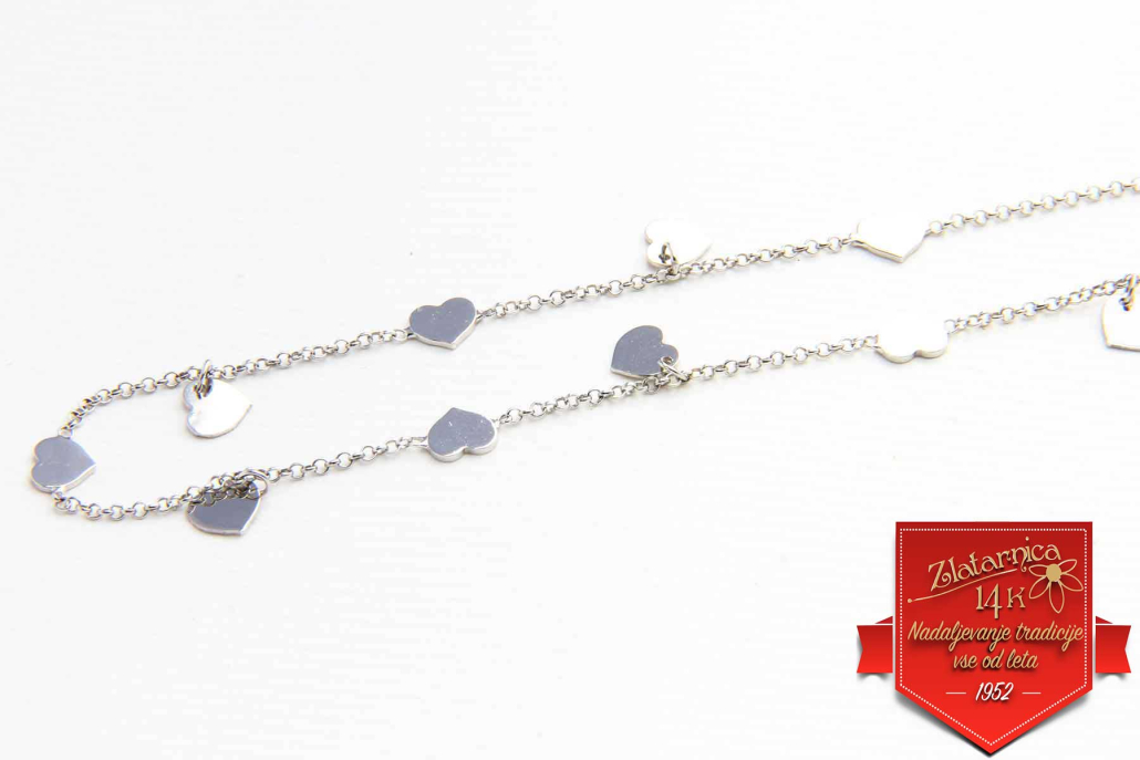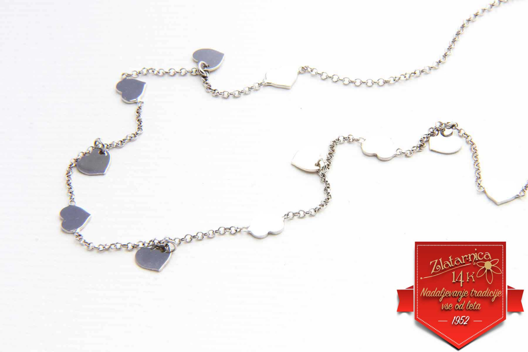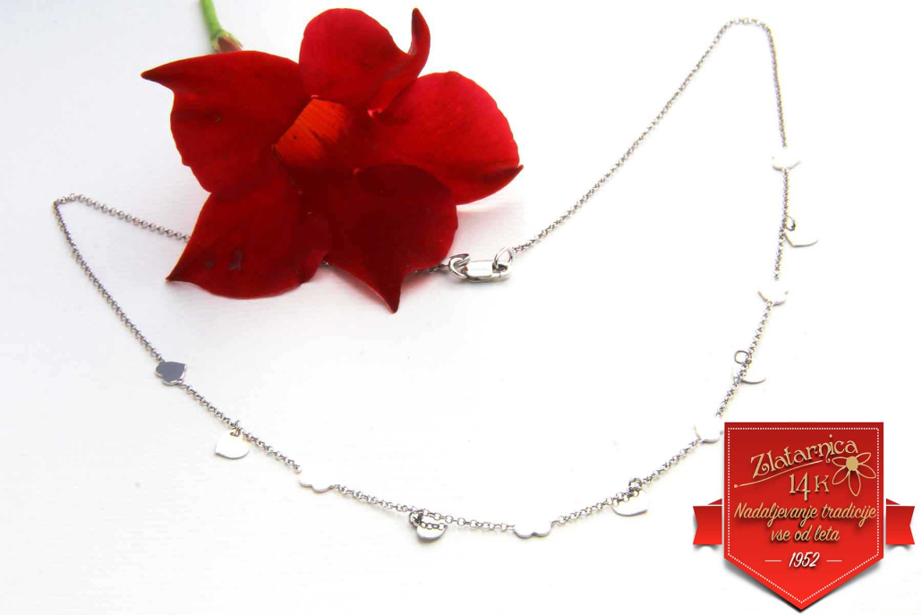 Ljubka ogrlica iz belega zlata s srčki v sprednjem delu. Odlično darilo za mlajša dekleta.