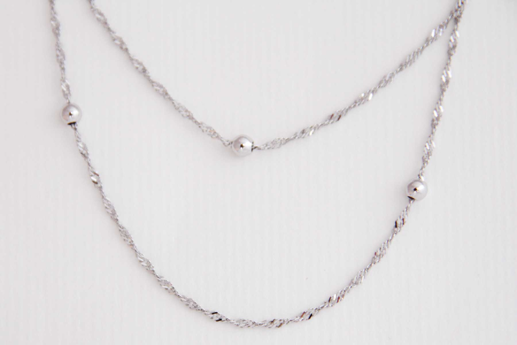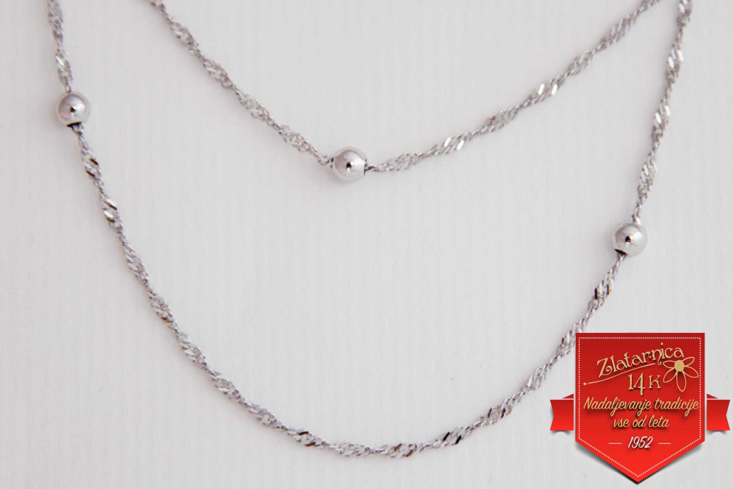 Ogrlica iz belega zlata, vezav singapur, med katerimi so vstavljene krogljice.