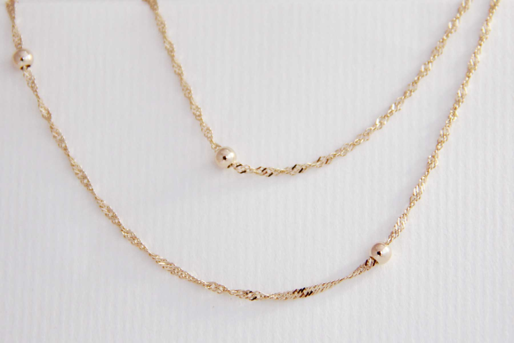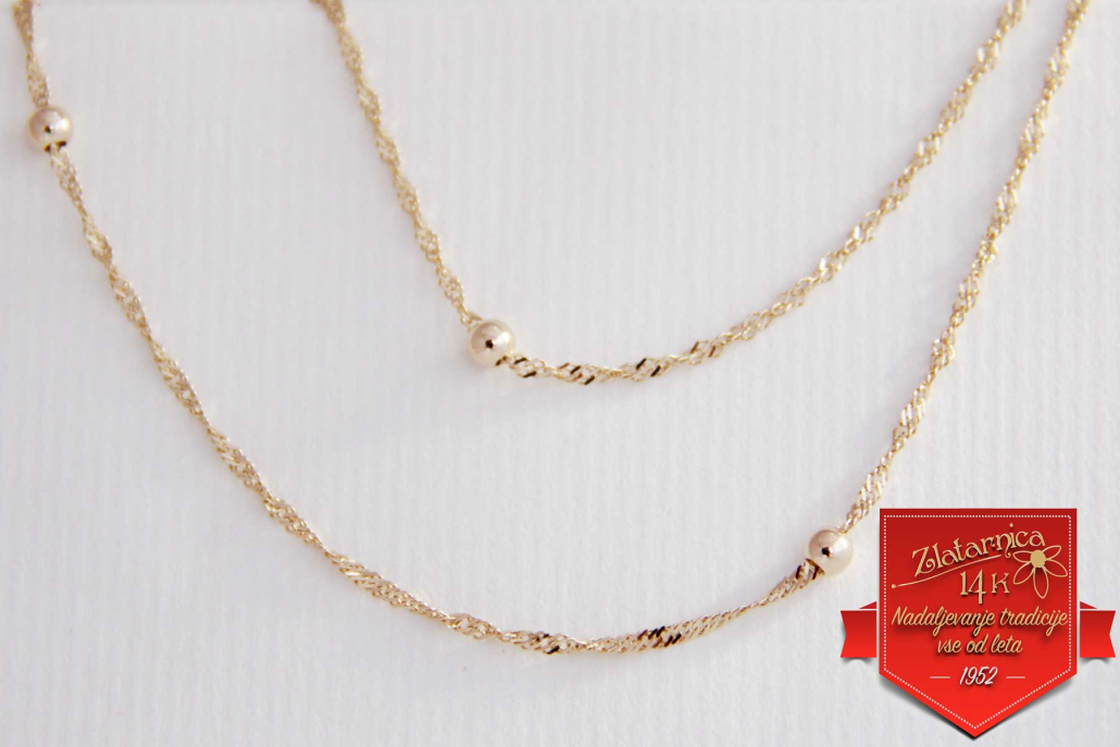 Ogrlica iz rumenega zlata, ki jo sestavljajo členi, vezani v vezu singapur, med katerimi so rumene bunkice.