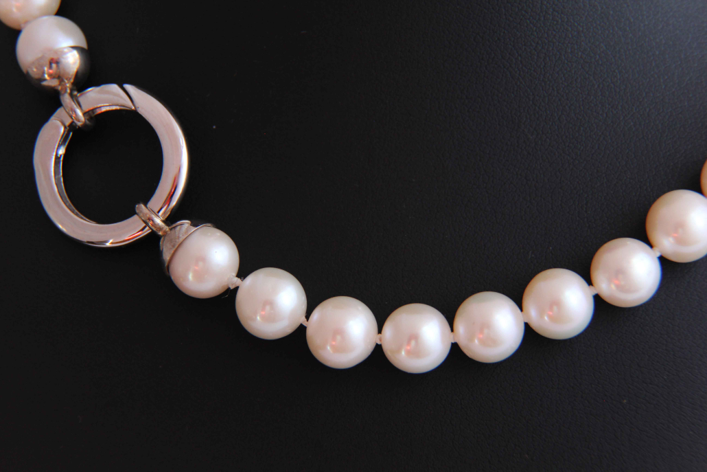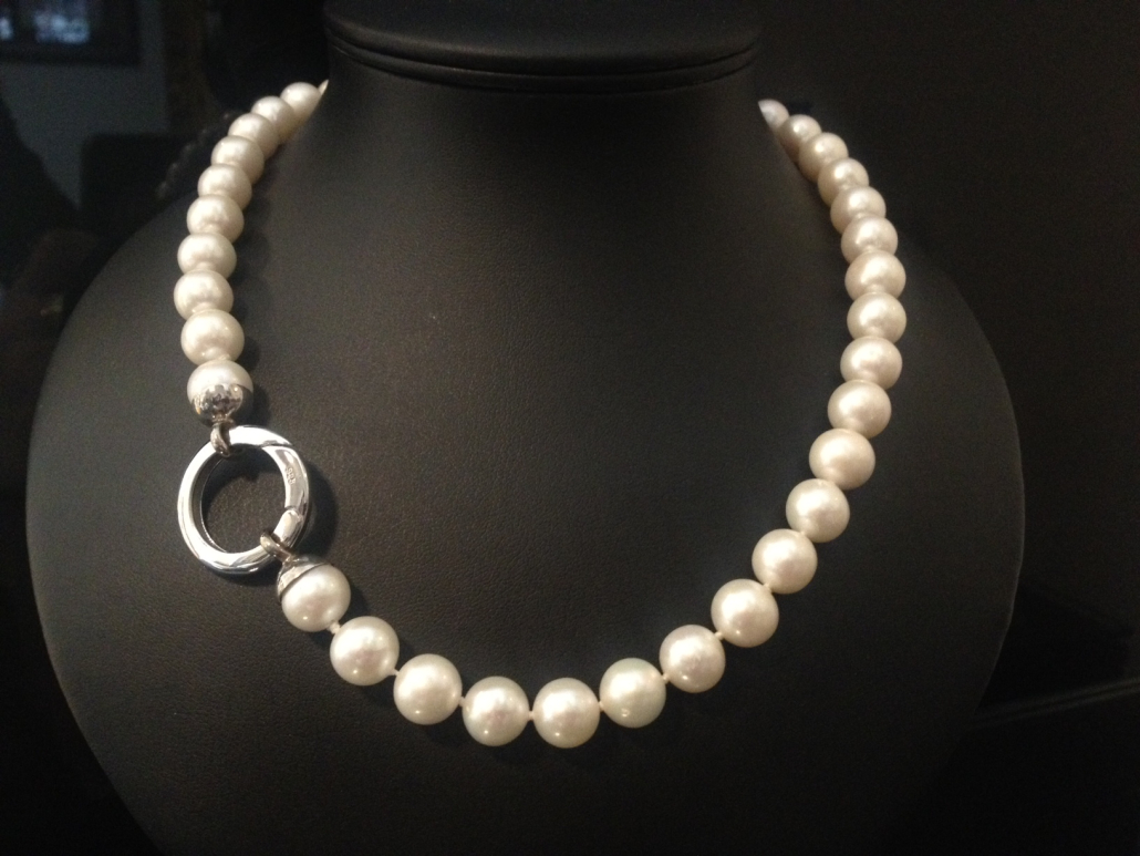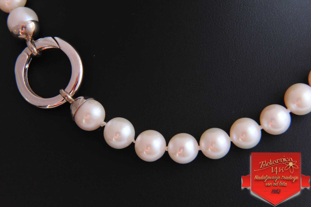 Ogrlica iz belih sladkovodnih biserov, nizana na vozle s srebrno mornarsko sponko.
