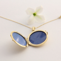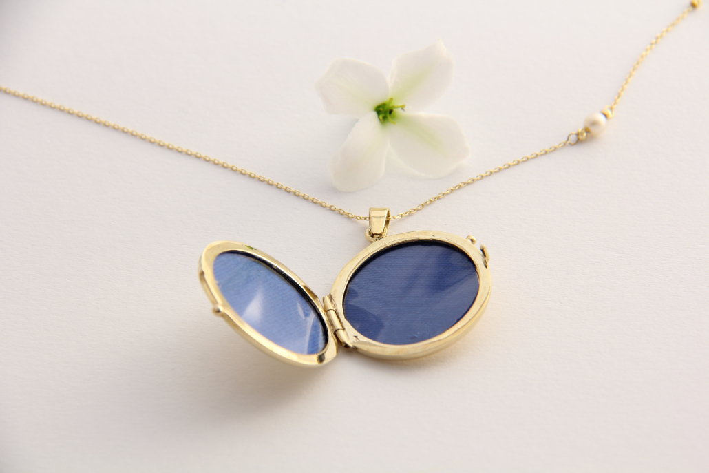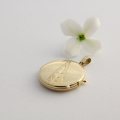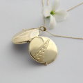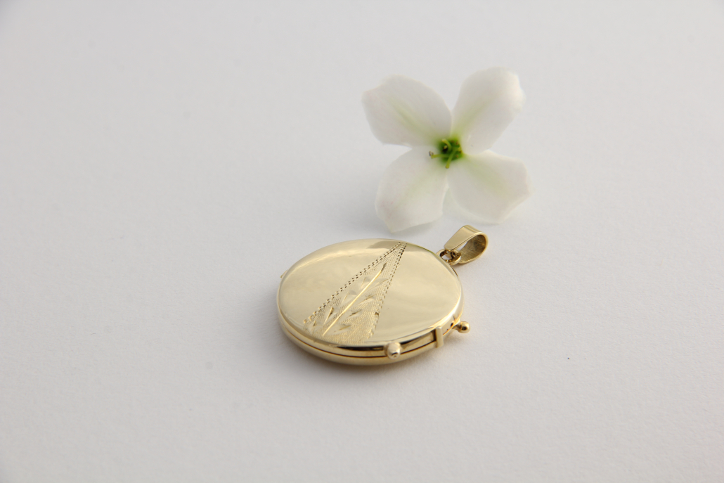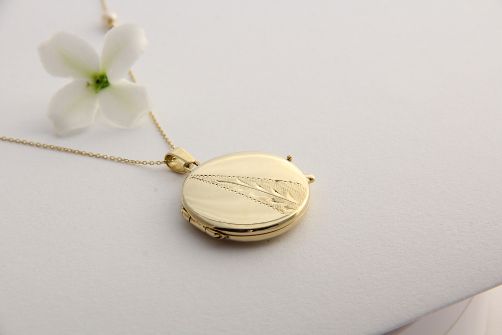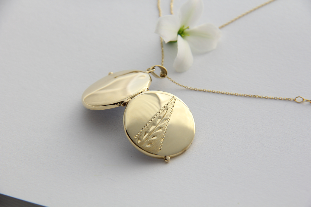 Veliki okrogli medaljon iz rumenega zlata z okrasno gravuro spredaj.