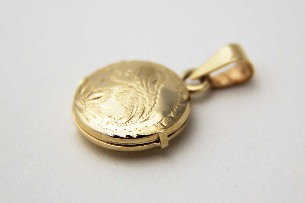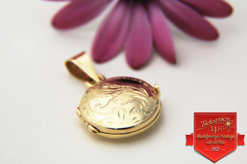 Okrogli medaljon iz rumenega zlata z okrasno baročno gravuro spredaj, ki se lahko razlikuje od fotografije.