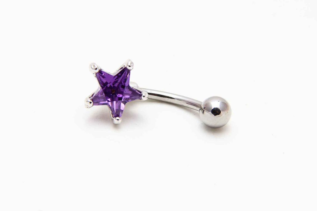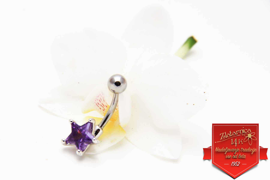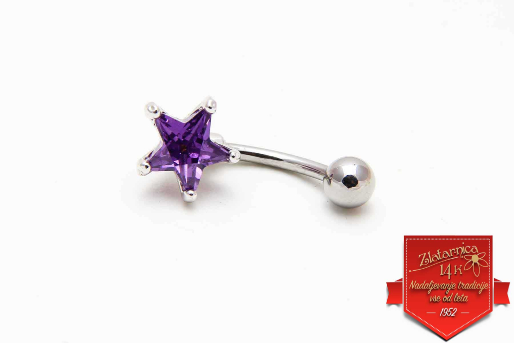 Pirsing za popek iz medicinskega jekla z violičnim cirkonom v obliki zvezde, zakovanim v srebrni okov.