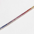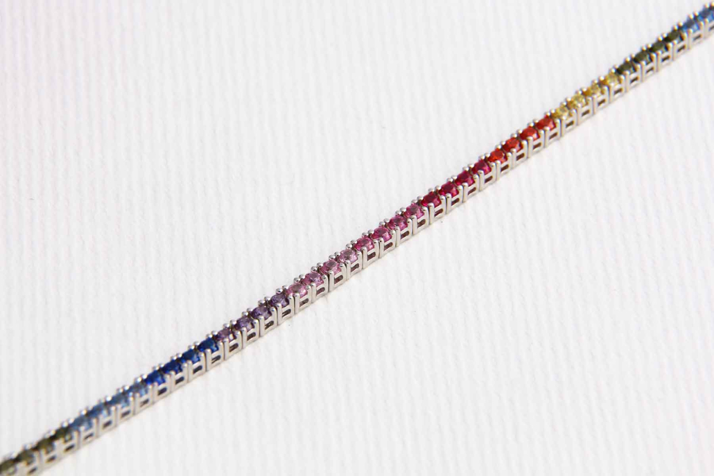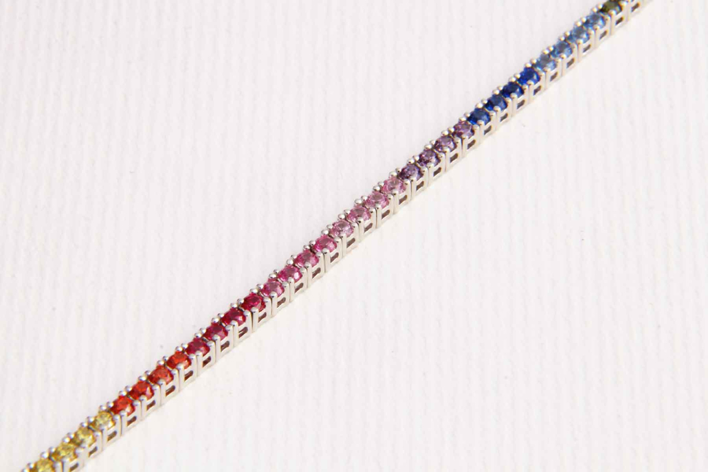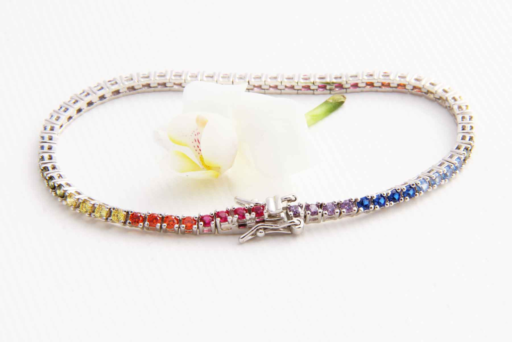 Elegantna zapestnica sestavljena iz zaporedno vstavljenih prosojnih kamnov različnih barv.