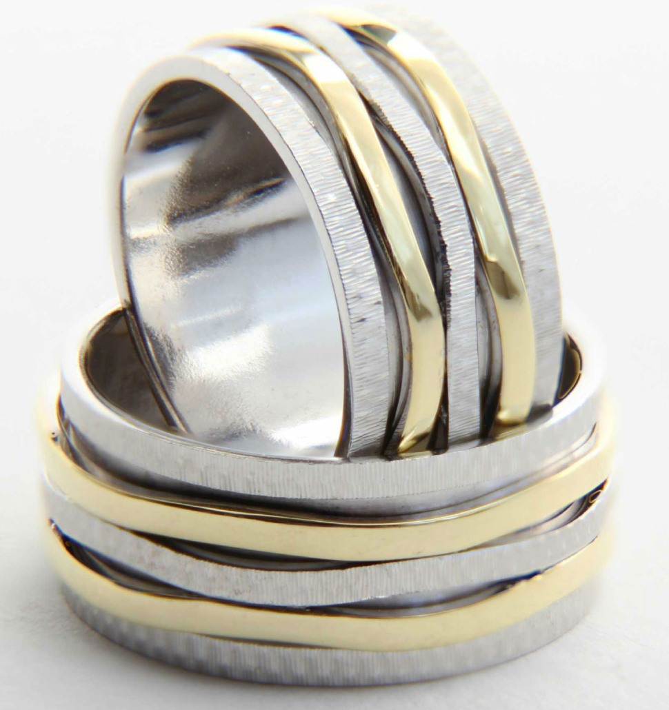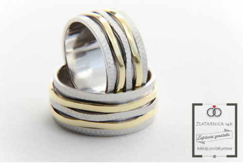 Par poročnih prstanov iz belega in rumenega zlata, ki se v pasovih izmenjujeta na prstanu.