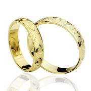 Par poročnih prstanov iz rumenega zlata z zunanjo gravuro. Prstana imata polkrožni profil.