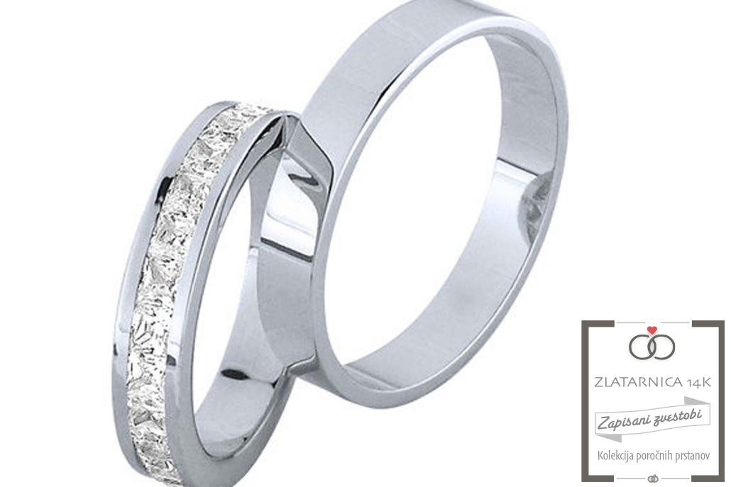 Par poročnih prstanov iz belega zlata. Prstana imata ravni profil. Prstana sta gladka, ženski prstan je obogaten s kamni.
