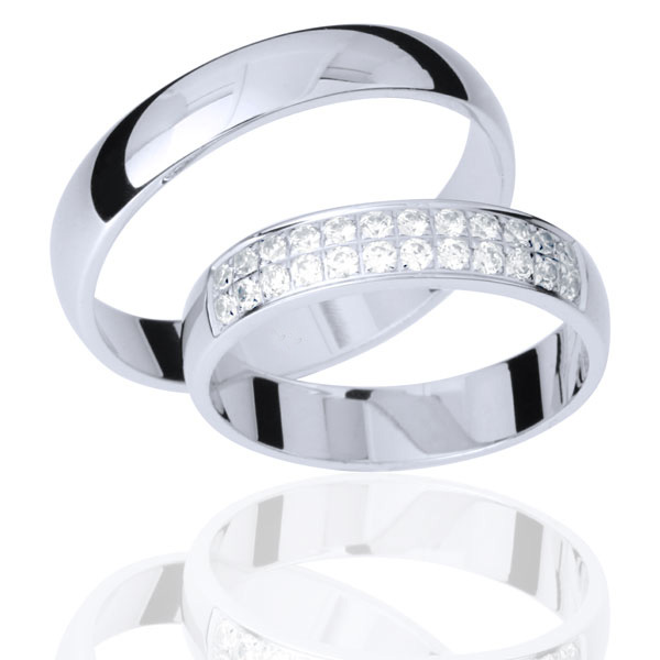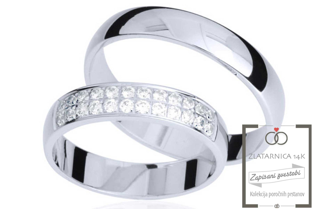 Par poročnih prstanov iz belega zlata. Prstana imata gladko površino, v ženski prstan so vkovani cirkoni.