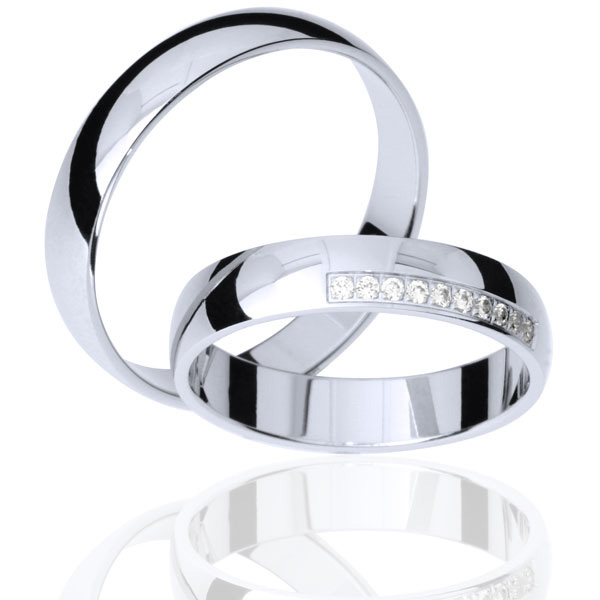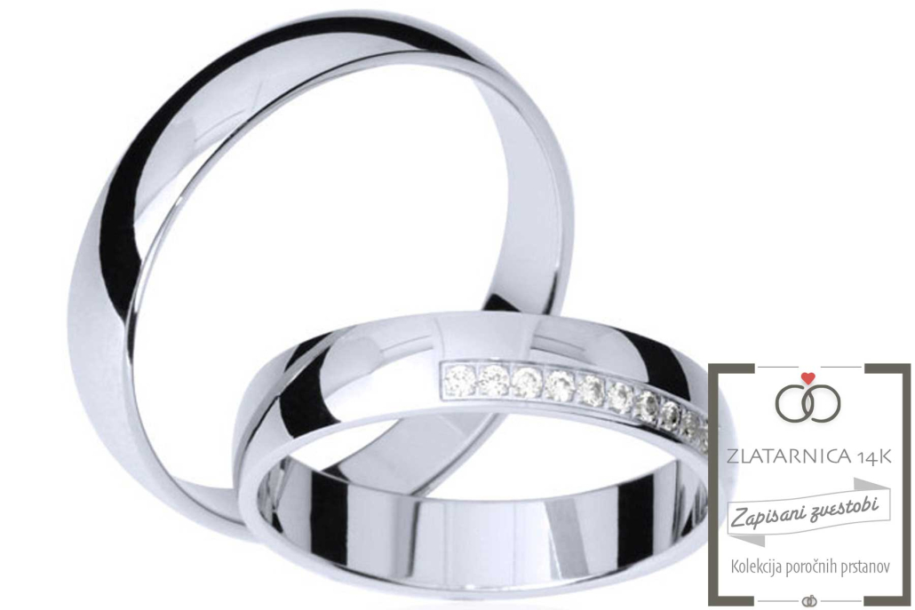 Par poročnih prstanov iz belega zlata. Prstana imata gladko površino, v ženski prstan so vkovani cirkoni.