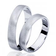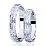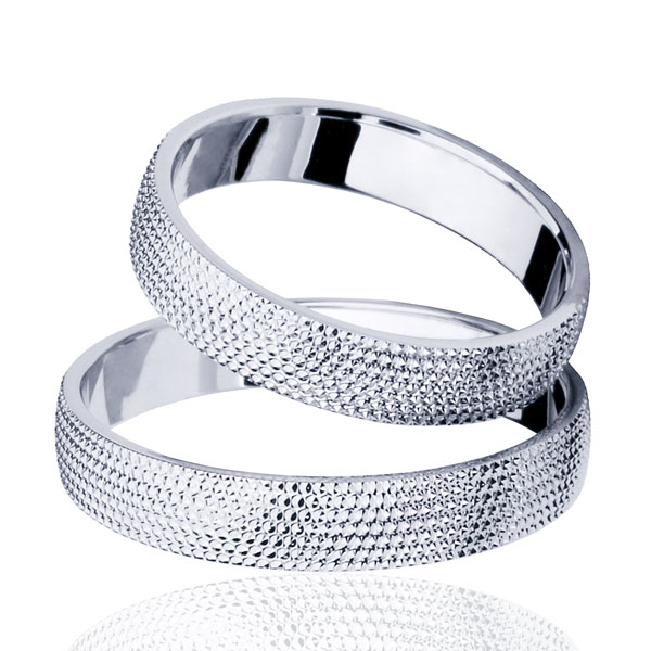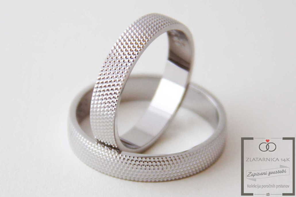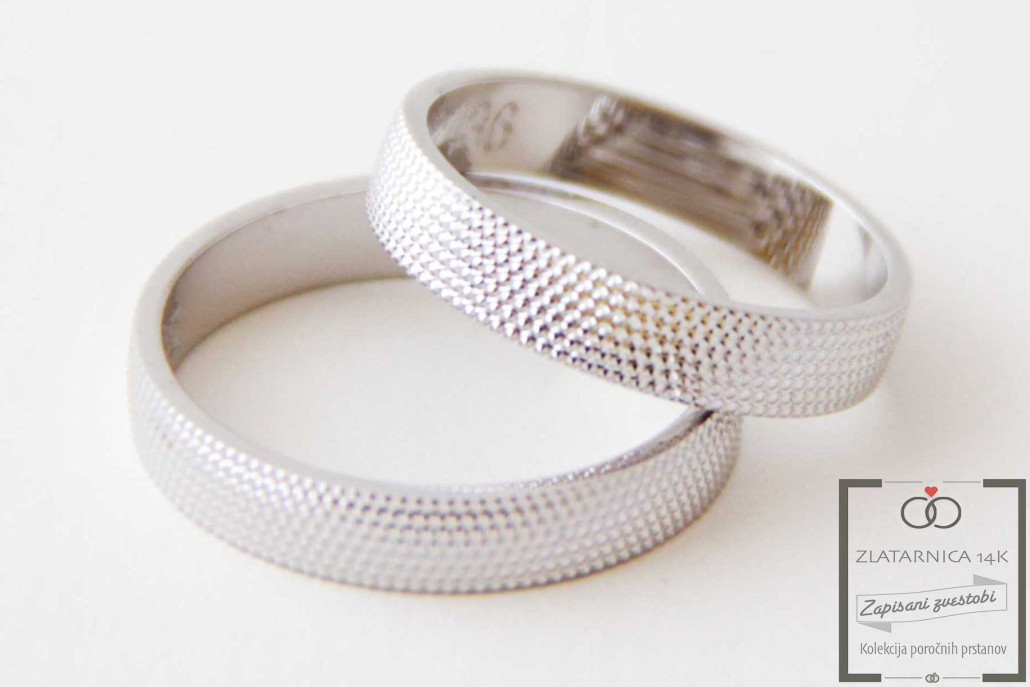 Par poročnih prstanov iz belega zlata rahlo polkrožnega profila z gravuro po celotni površini.
