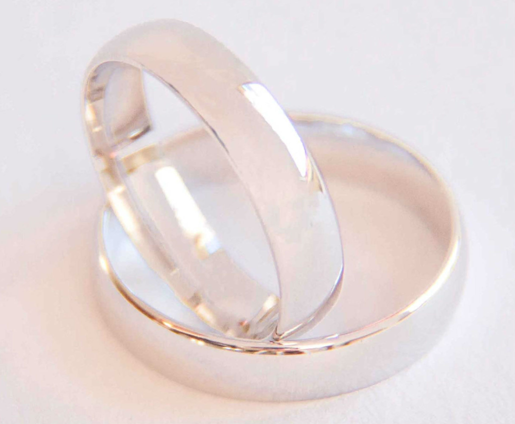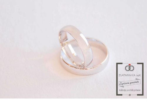 Par poročnih prstanov iz belega zlata. Površina prstana je gladka, po želji jo lahko obdelamo tudi na kakšen drug način (matirana, peskana, satinirana…).