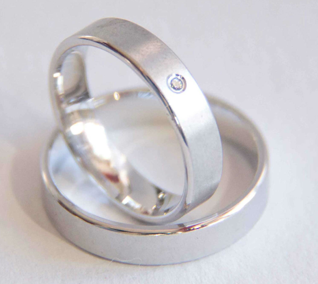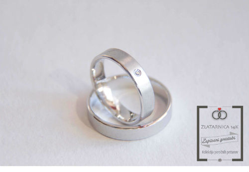 Par poročnih prstanov iz belega zlata. V ženski prstan je vkovan kamenček (cirkon ali briljant), število kamenčkov vam lahko poljubno spremenimo. Površina prstana je matirana, po želji jo lahko obdelamo tudi na kakšen drug način (gladka, peskana, satinirana…).