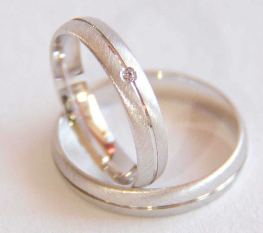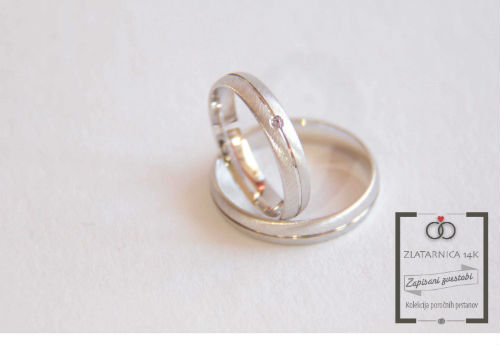 Par poročnih prstanov iz belega zlata. V ženski prstan je vkovan kamenček (cirkon ali briljant), število kamenčkov vam lahko poljubno spremenimo. Površina prstana je satinirana z gladko črto po sredini prstana, po želji jo lahko obdelamo tudi na kakšen drug način (gladka, peskana, matirana…).
