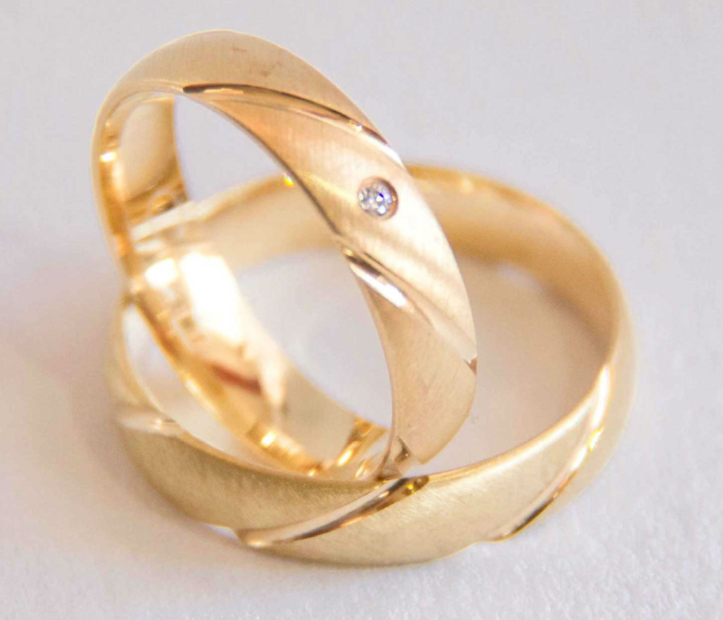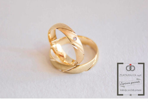Par poročnih prstanov iz rumenega zlata. V ženski prstan je vkovan kamenček (cirkon ali briljant), število kamenčkov vam lahko poljubno spremenimo. Površina prstana je matirana in gladka, po želji jo lahko obdelamo tudi na kakšen drug način (gladka, peskana, satinirana…).